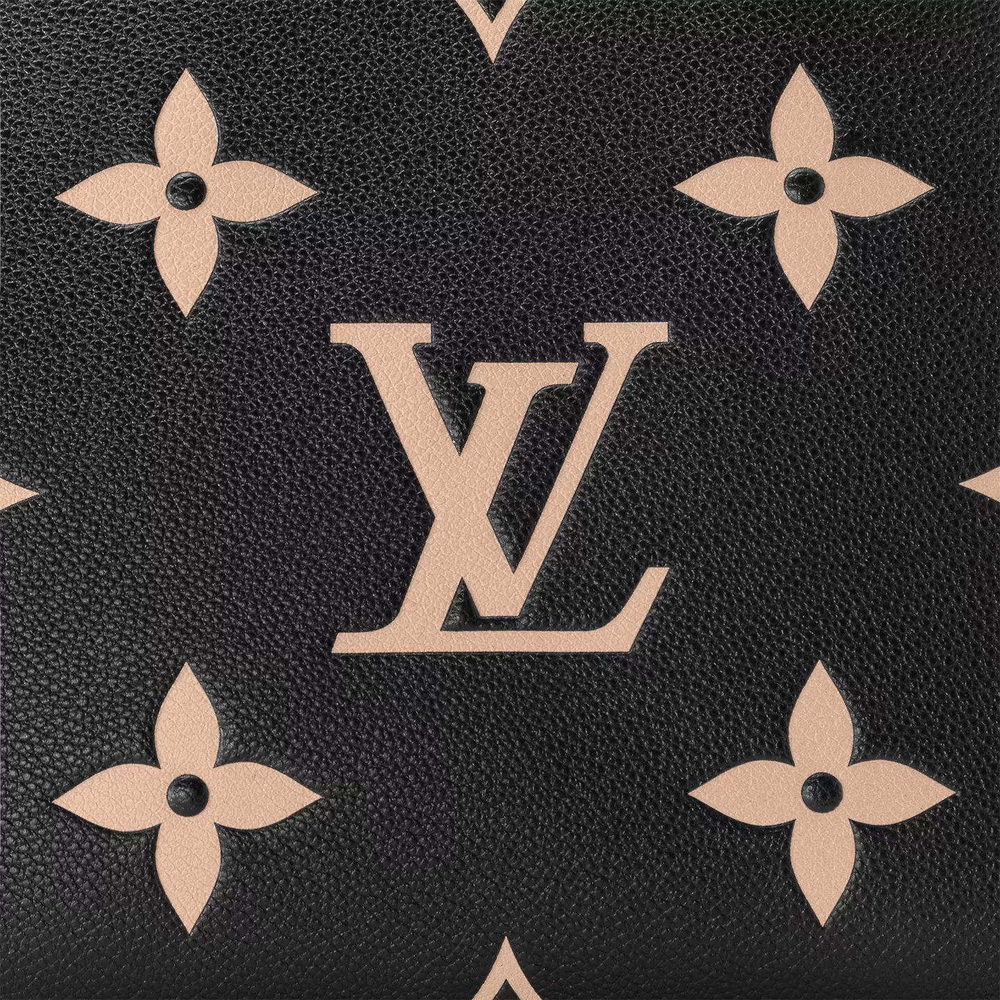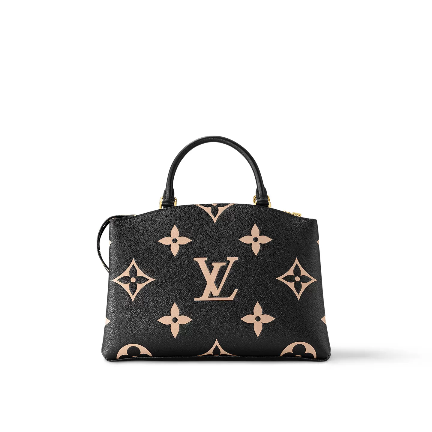 The perfect everyday companion, the smart and sophisticated Petit Palais handbag is fashioned from grained leather with an oversized pattern of Monogram Flowers and LVs printed and embossed on it. The gold-color padlock and leather name tag bring to mind the House’s legacy of fine luggage. A detachable strap can be adjusted for comfortable shoulder and cross-body wear.