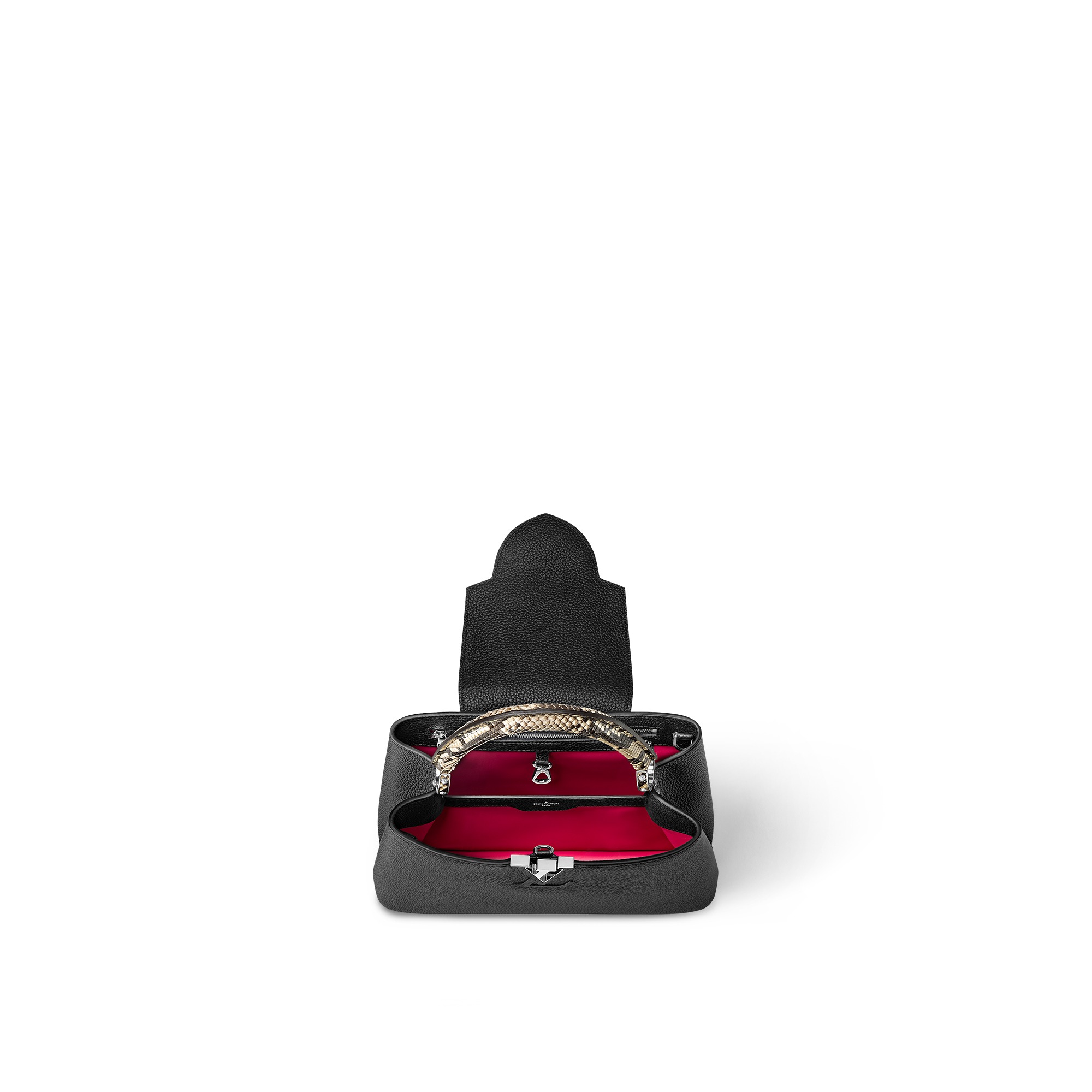 Named for the Rue des Capucines in Paris, where Louis Vuitton opened for business in 1854, this Capucines MM handbag was first introduced in 2013. Superbly crafted from full-grain Taurillon leather, it features a distinctive flap which can be worn two ways: outside to reveal a Monogram Flower, or inside to display the leather-wrapped LV Initials. This elevated model has a top handle made from luxe python skin – a sophisticated touch.