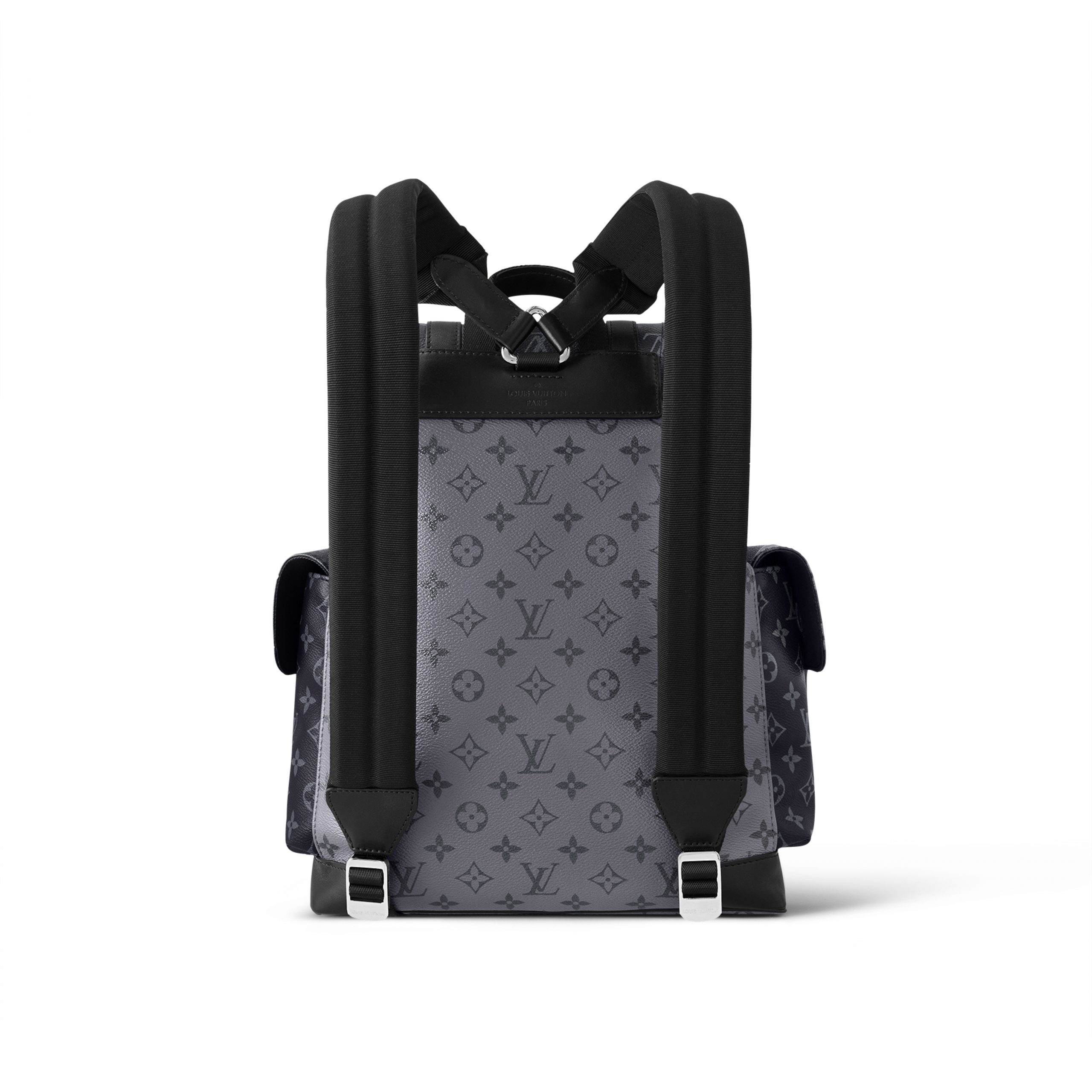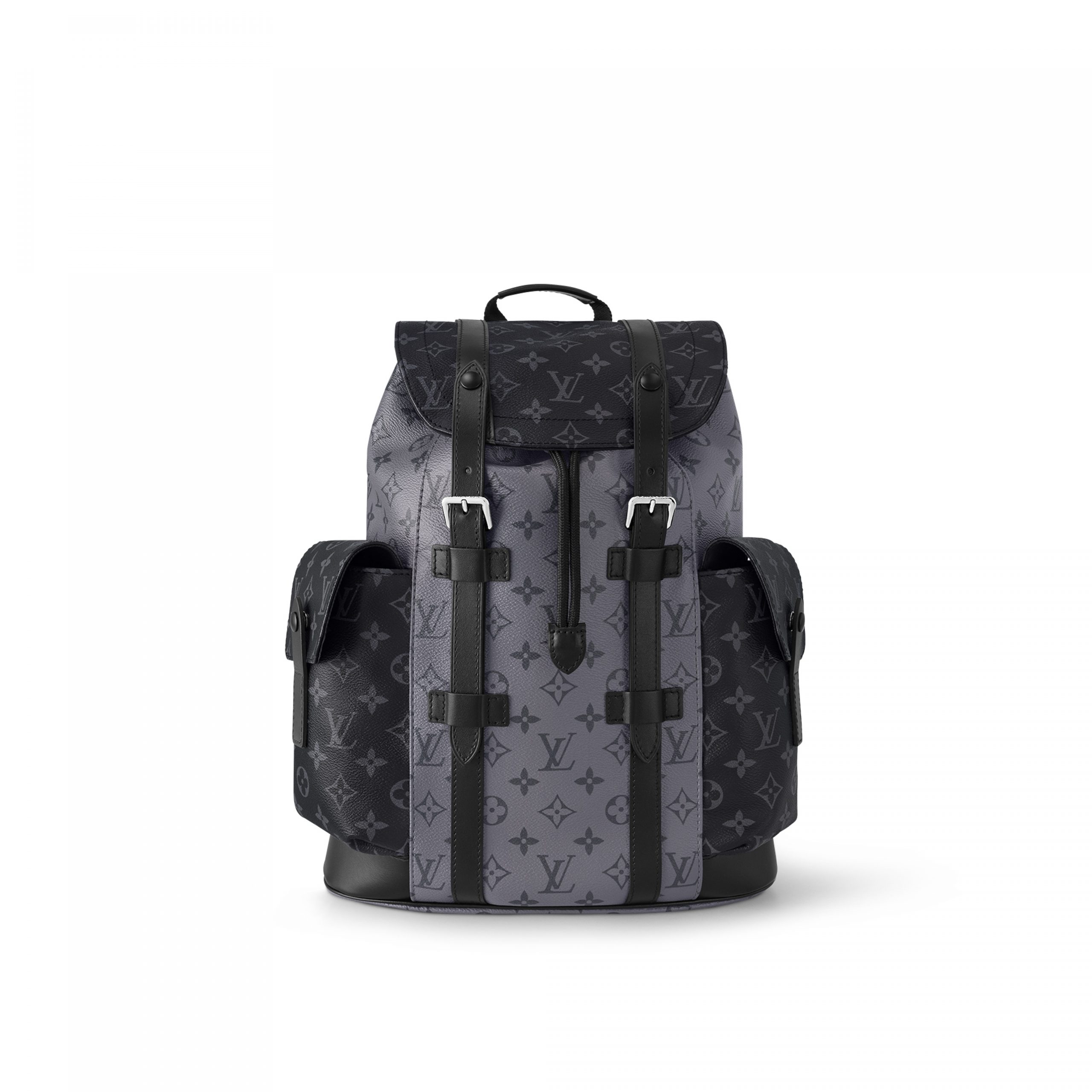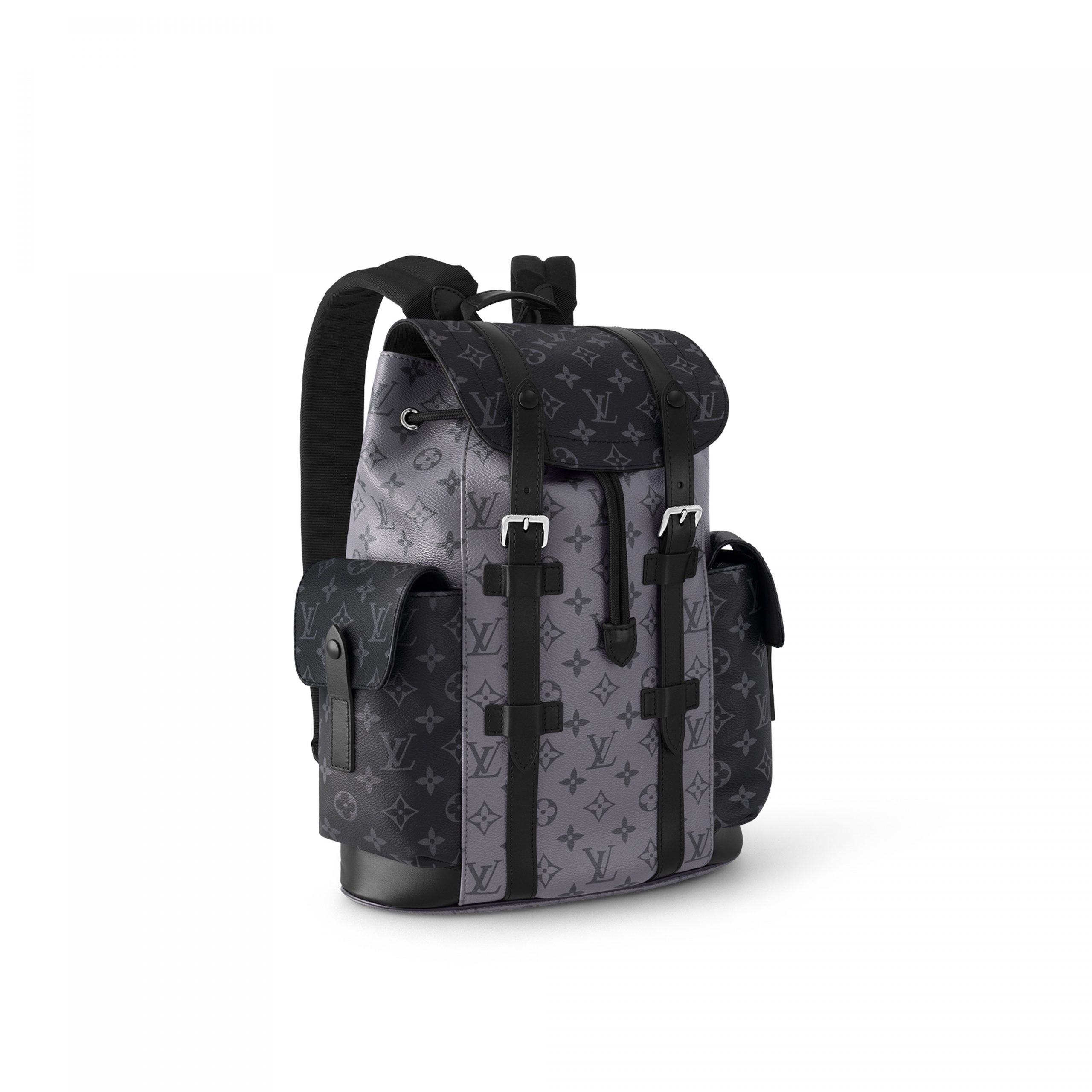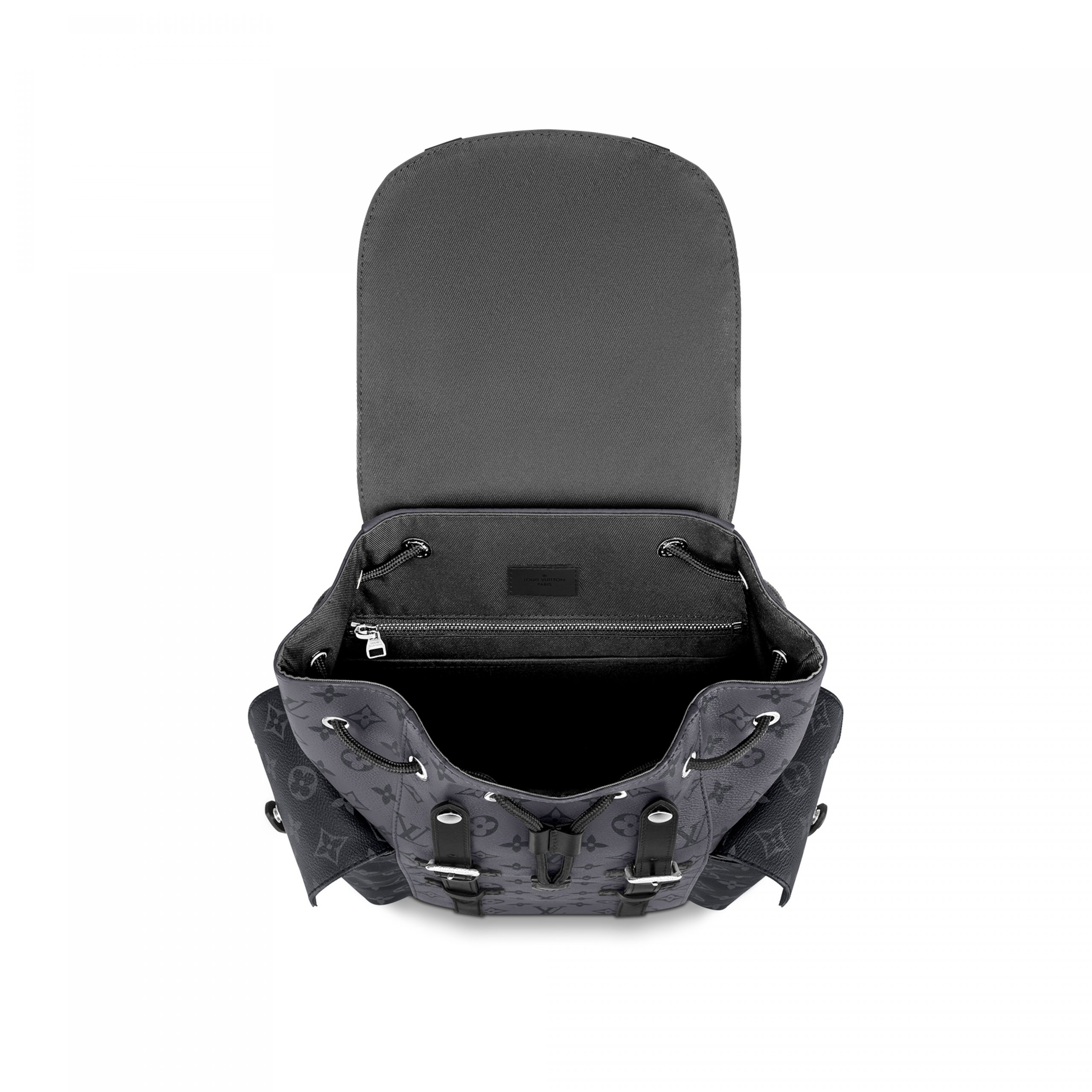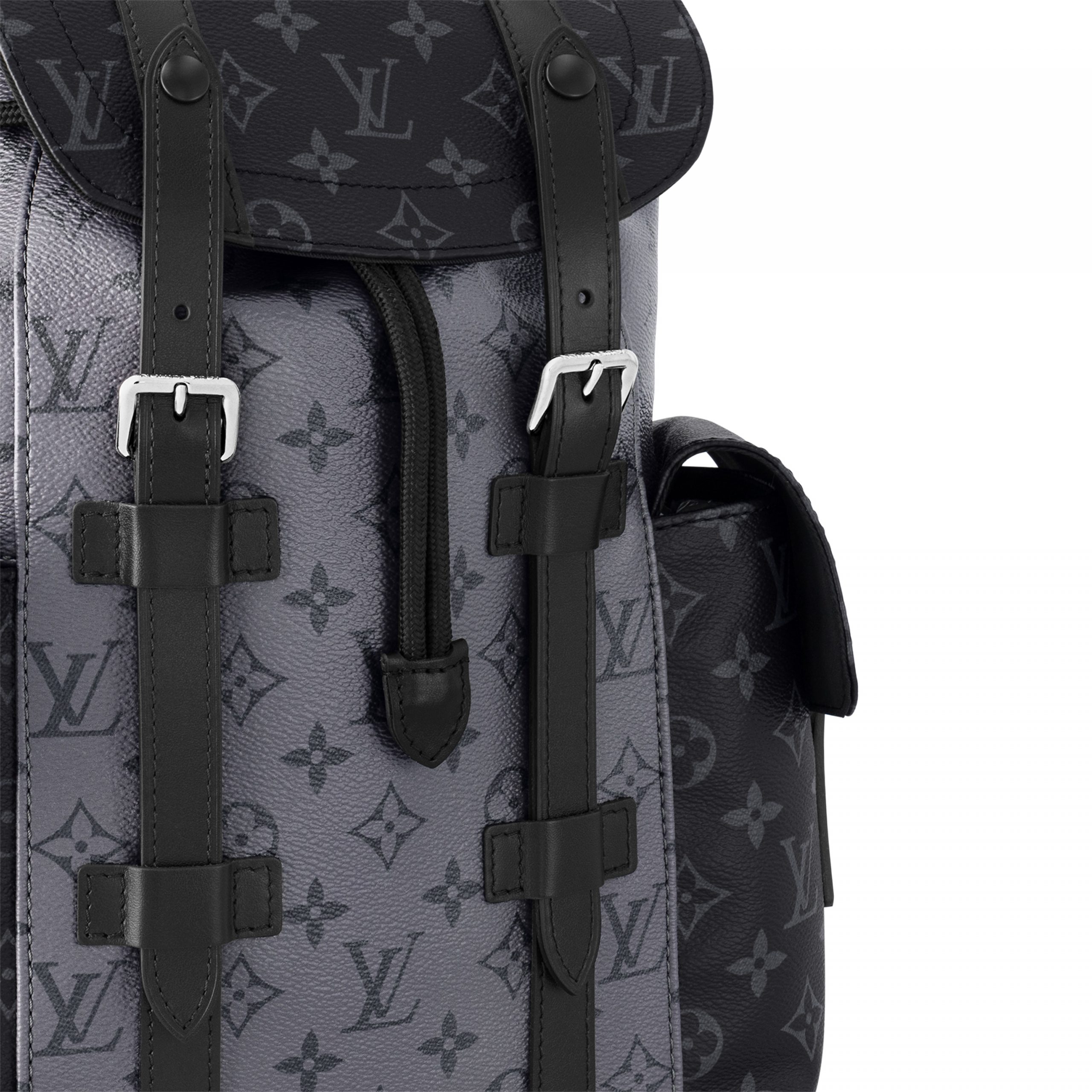 The Christopher PM backpack takes on a striking aspect in Monogram Eclipse Reverse canvas with black leather trim. Two side pockets enable quick access to essentials, while the leather flap with press stud closure keep belongings safe. The Christopher PM is inspired by the design of the rugged hiking rucksack, rendered here in smaller dimensions.