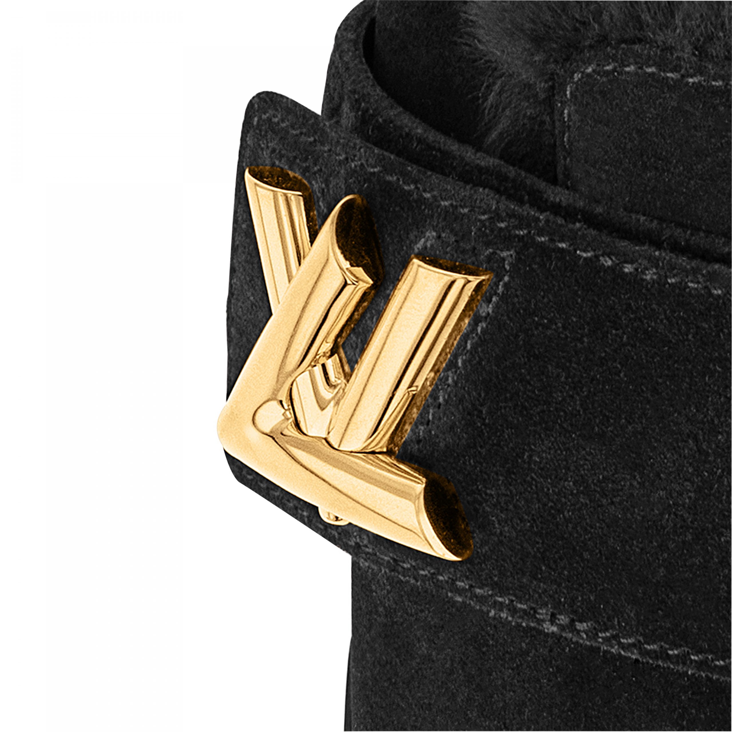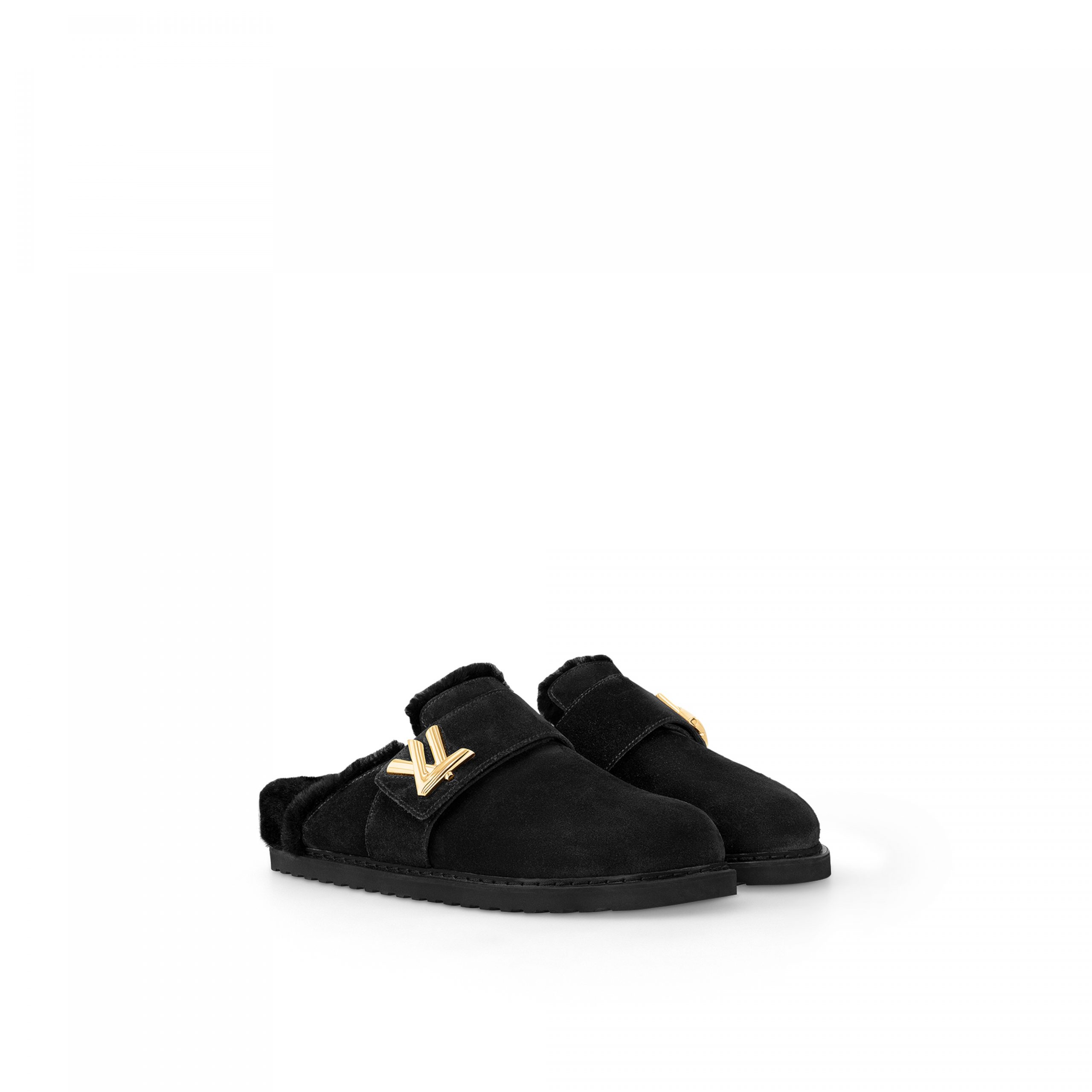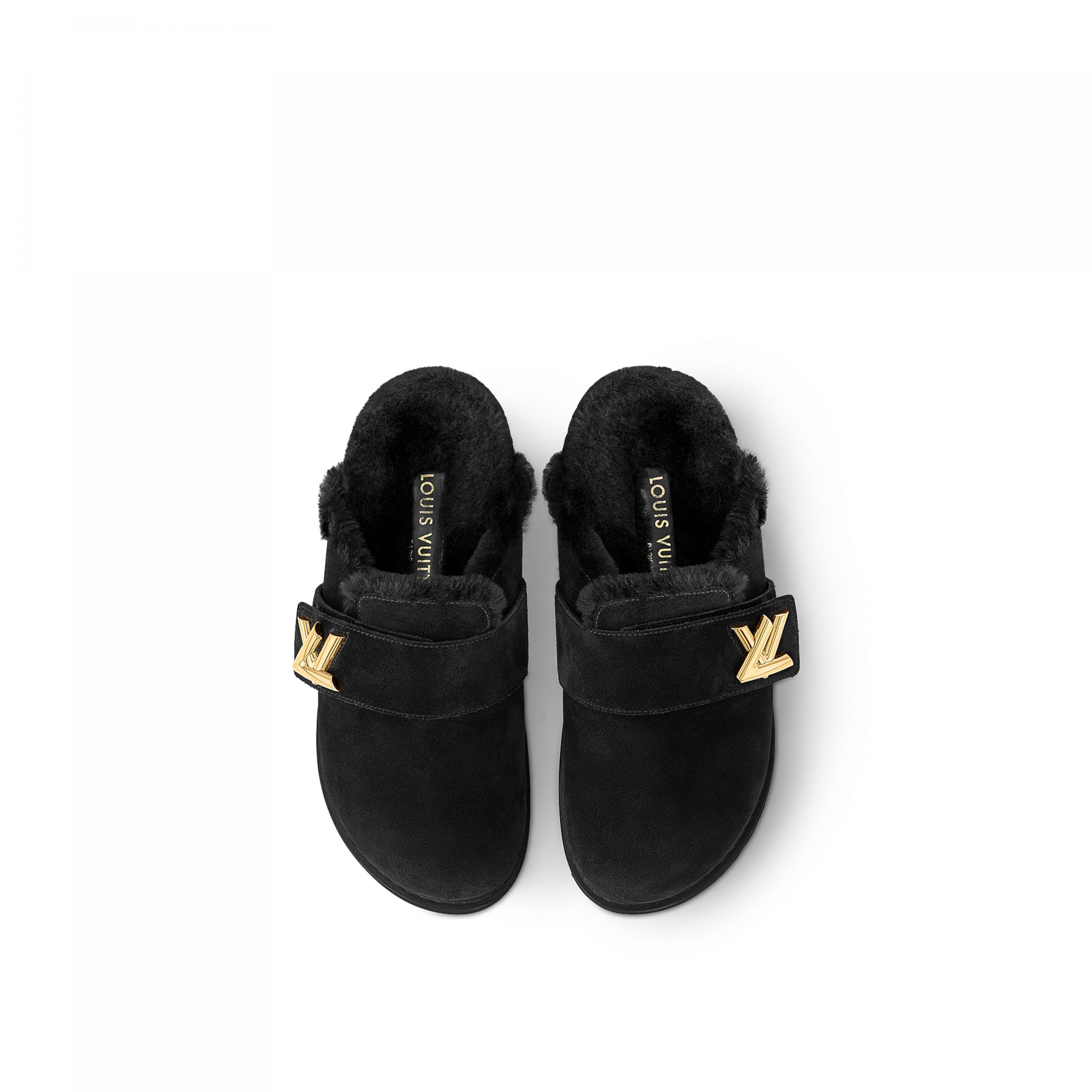 The LV Cosy flat comfort clog lives up to its name in suede calf leather with a snug shearling lining. This style combines the comfort of an anatomic footbed and lightweight micro outsole with the refinement of a gold-tone LV accessory inspired by the clasp of the iconic Twist bag.