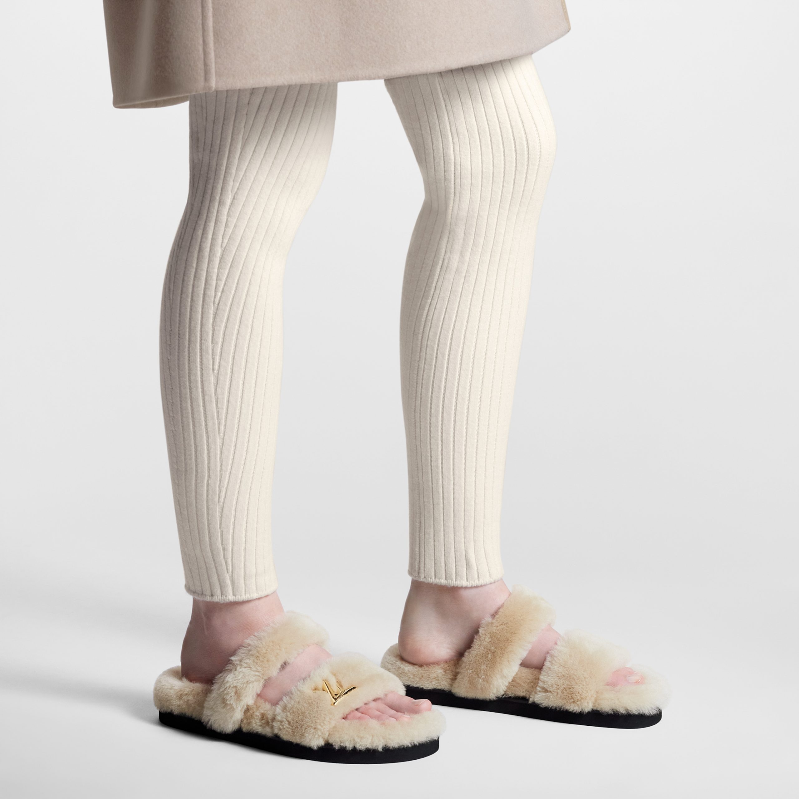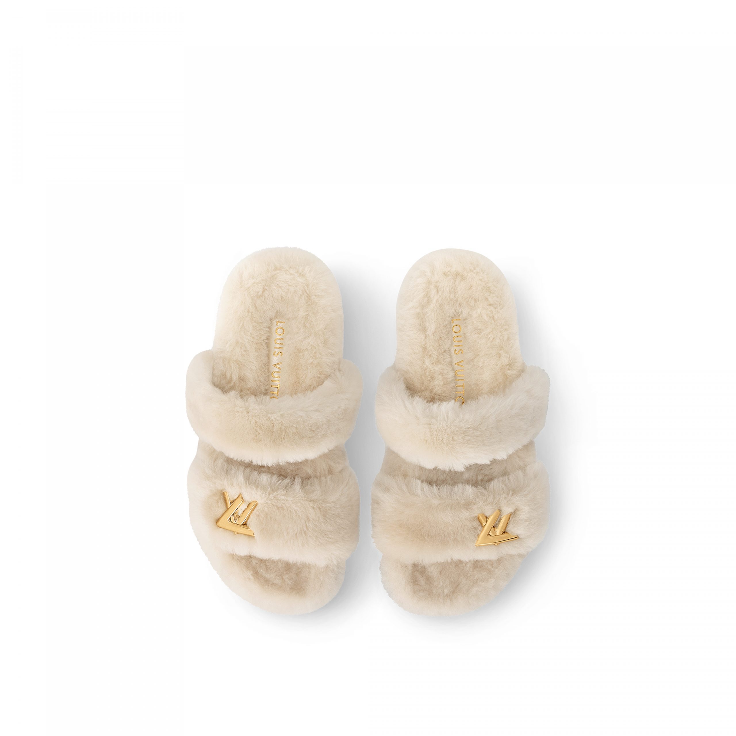 The LV Sunset flat comfort mule is crafted from fluffy shearling for ultimate softness and comfort. Ideal for travel and both indoor and outdoor wear, this on-trend model features two straps: one adjusted with velcro, the other embellished with a gold-tone LV accessory. An anatomic insole and lightweight micro outsole complete this design.