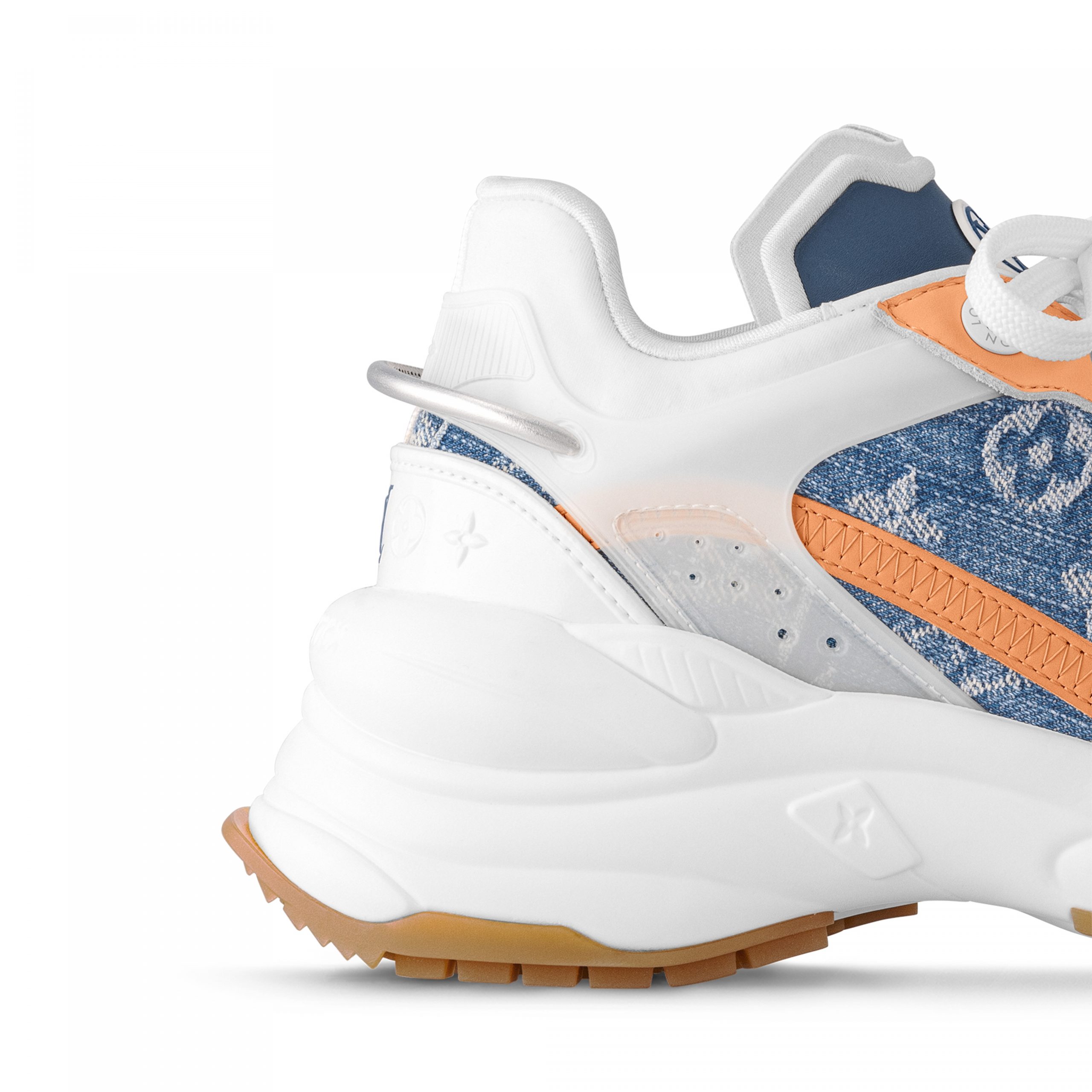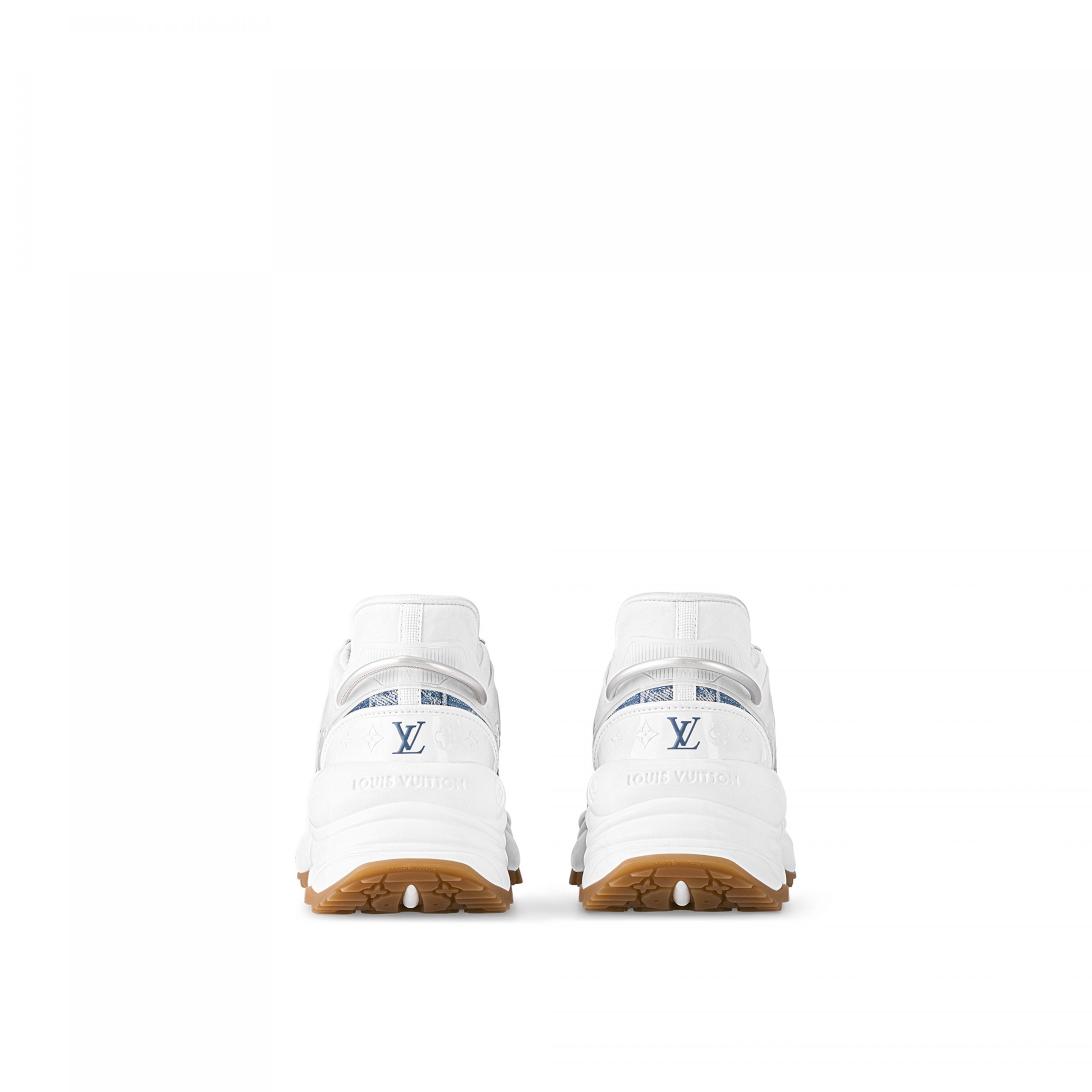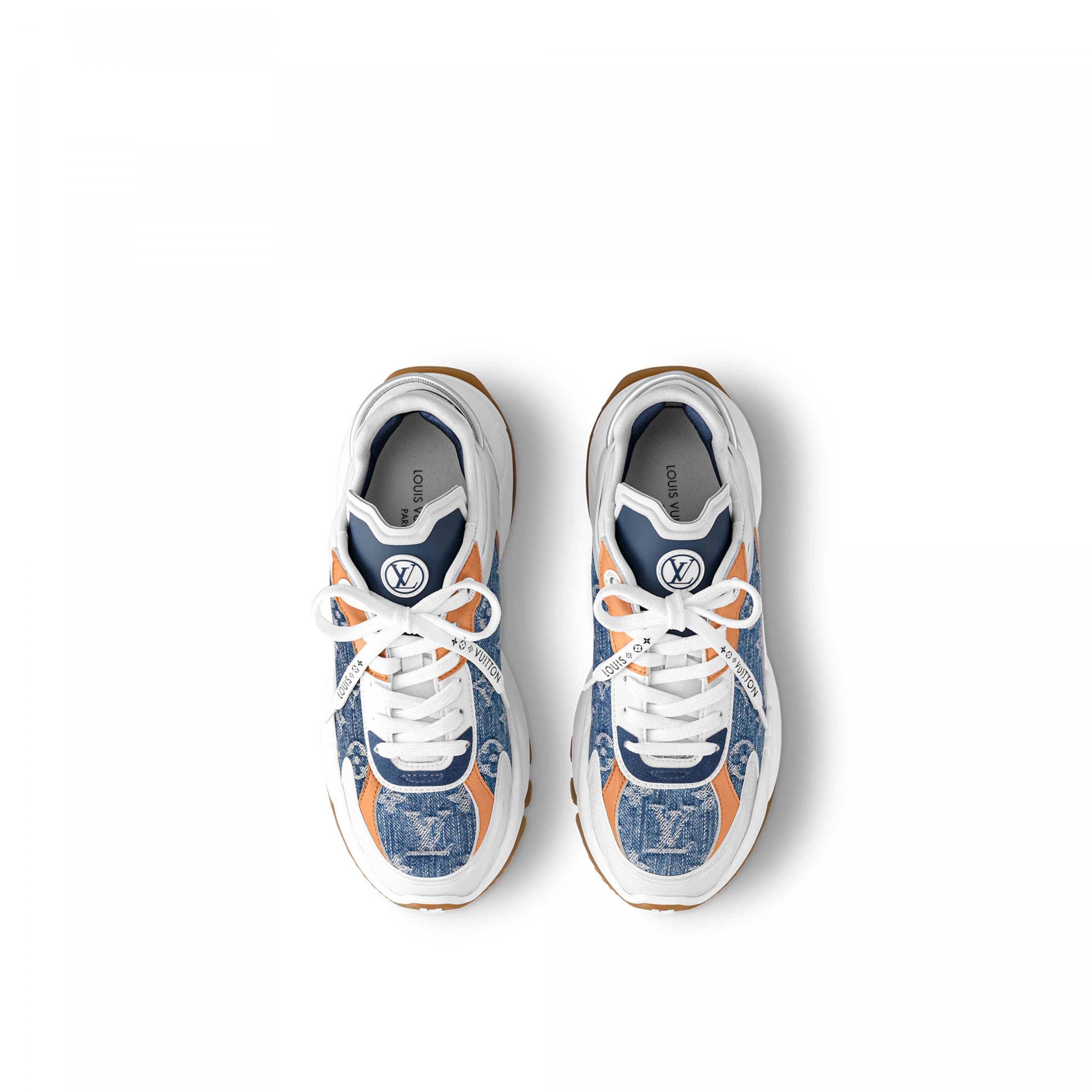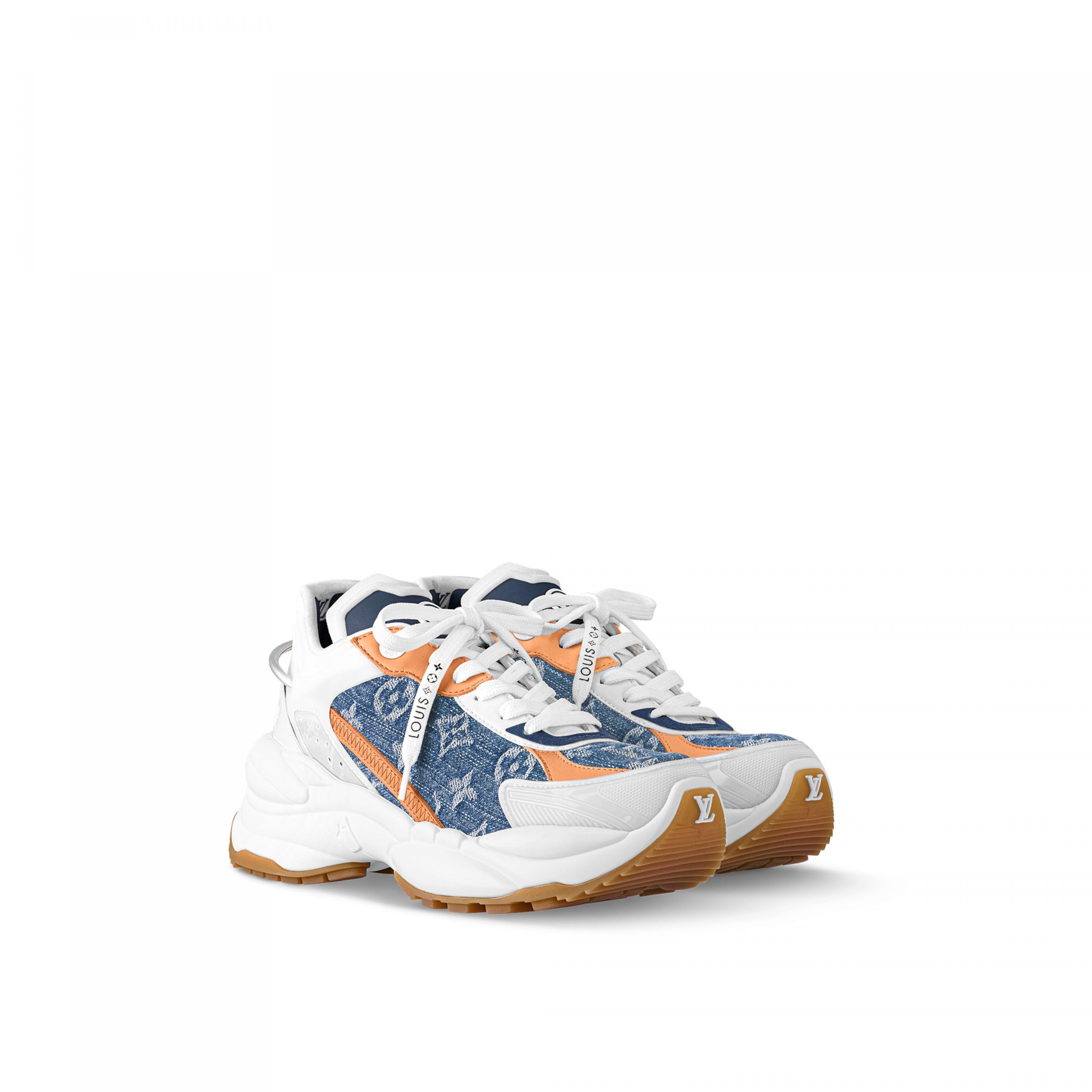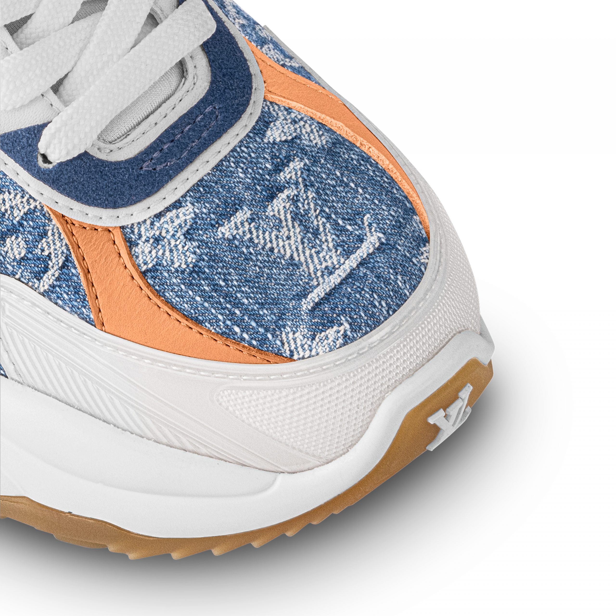 The Run 55 sneaker combines technical materials with two iconic Louis Vuitton signatures: Monogram denim and natural calf leather. This city sneaker has a design inspired by running shoes and features a lifted rubber outsole for optimum bounce and comfort. It is signed with an LV Circle on the tongue and the LV Initials on the front.