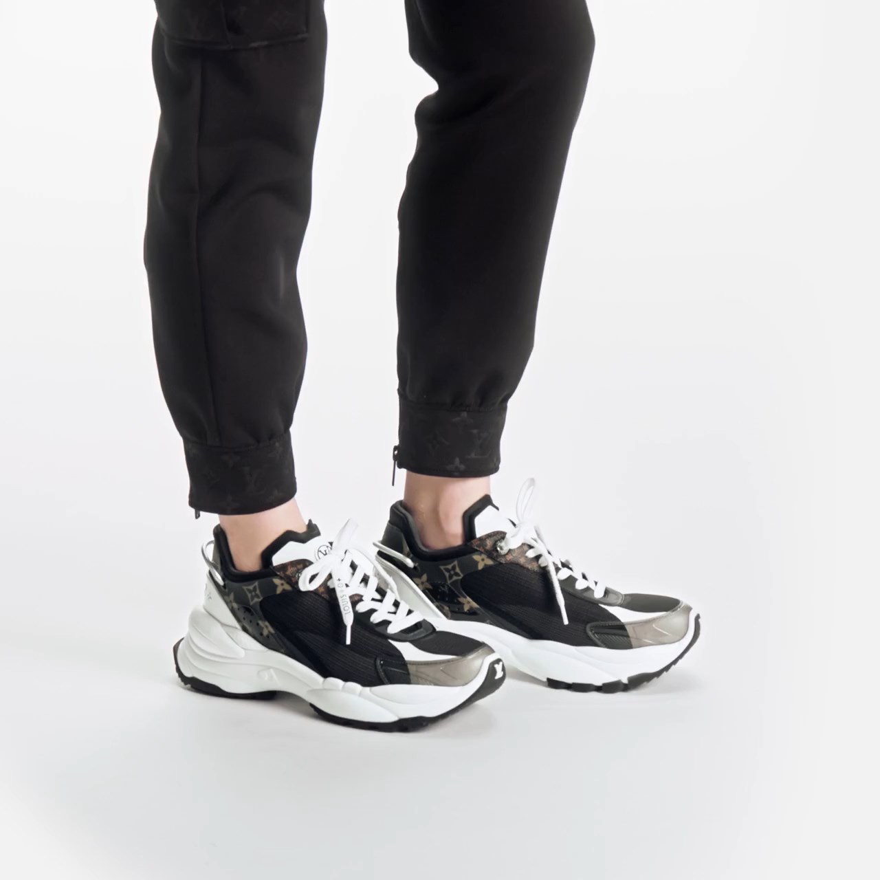 Monogram canvas complements the sporty design of the Run 55 sneaker, which was inspired by racewear. This model is notable for its elaborate upper, constructed from overlays of technical materials, and lifted outsole for optimum bounce and comfort. It is embellished with Monogram tape on the sides and the LV Initials on the front and back.
