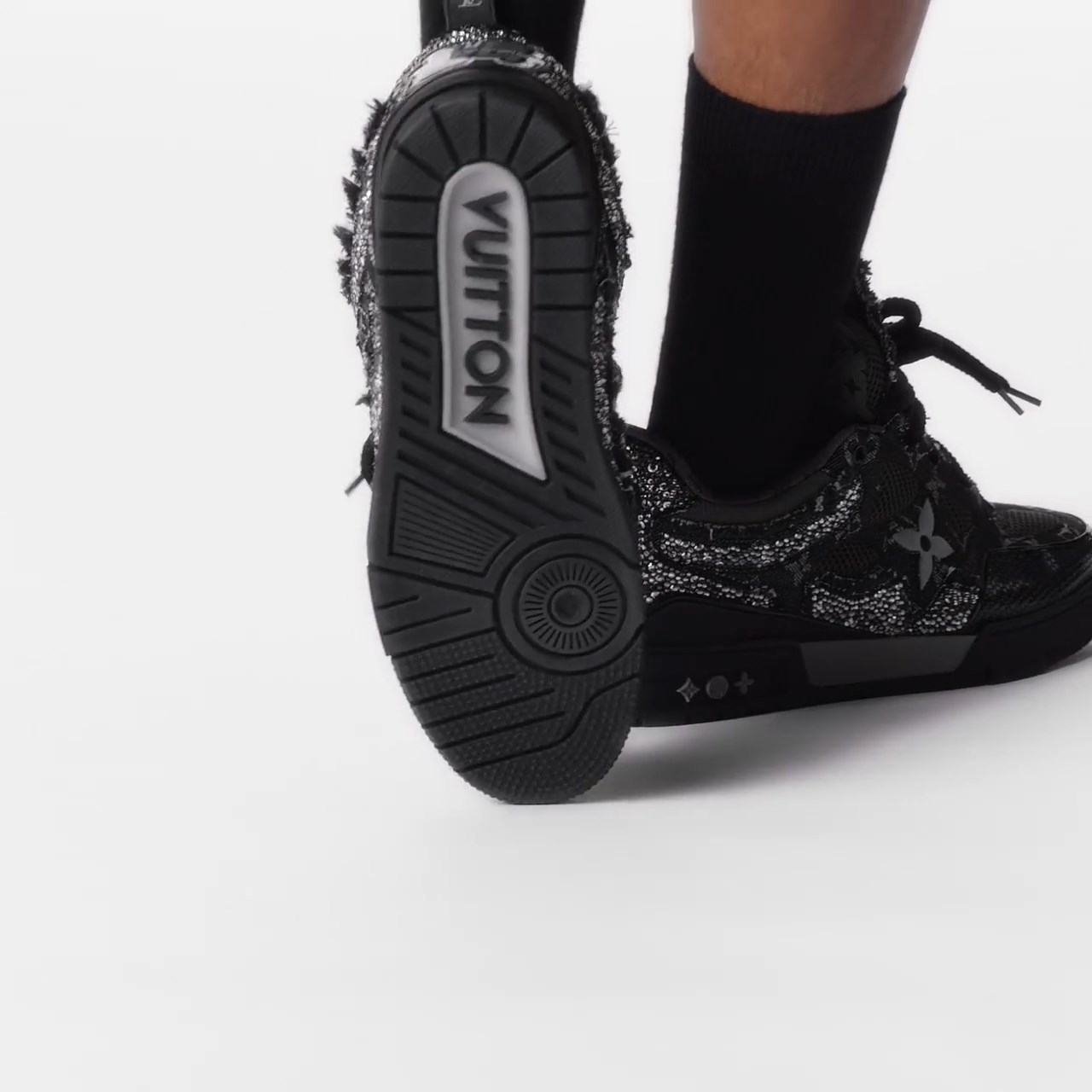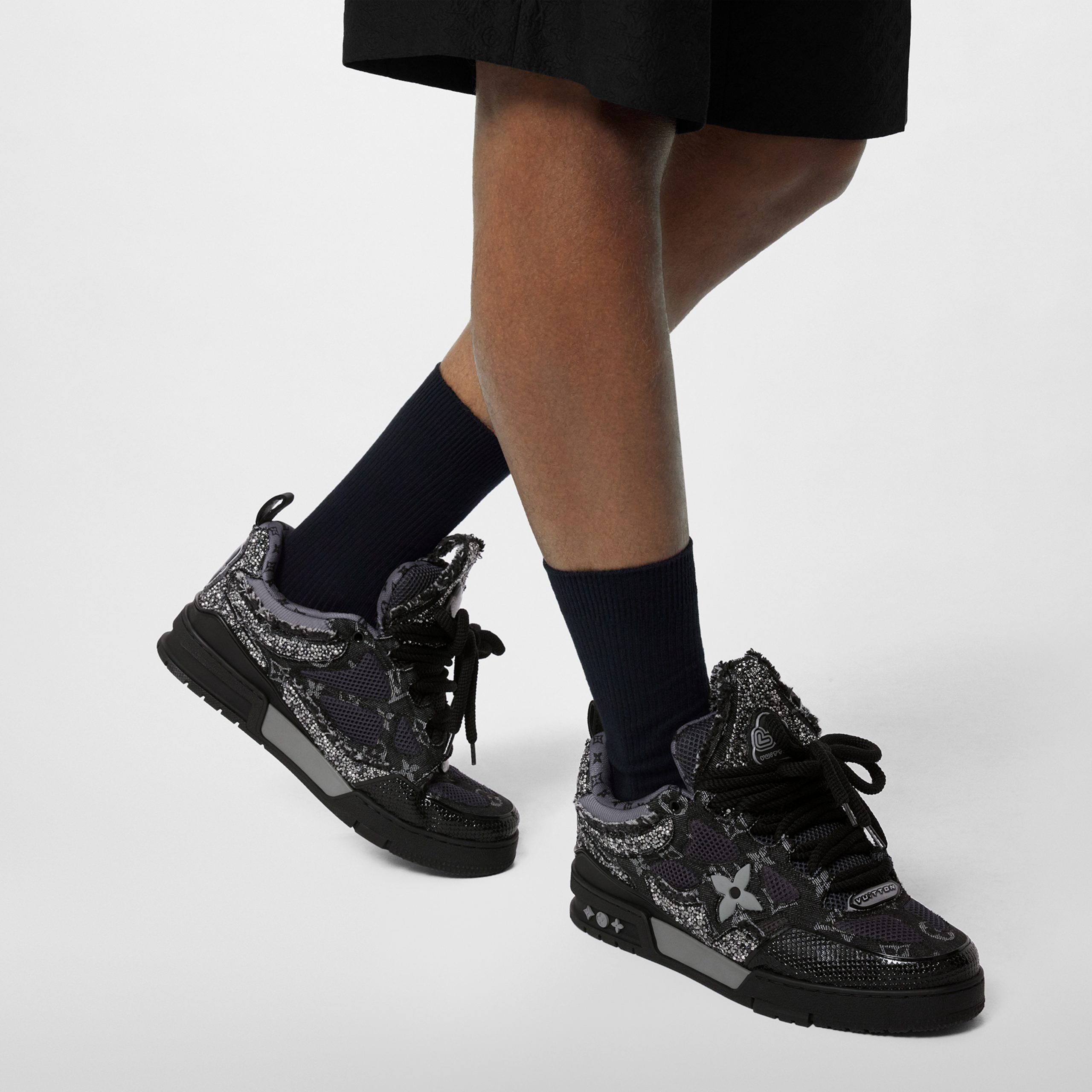 This exceptional edition of the LV Skate sneaker combines Monogram denim with sparkling Swarovski™ crystals and technical mesh. This Nineties-inspired design is characterized by its padded collar and tongue, which features an LV since 54 logo, referring to 1854, when Louis Vuitton was founded. Technical double laces and a bicolor rubber outsole complete this model.