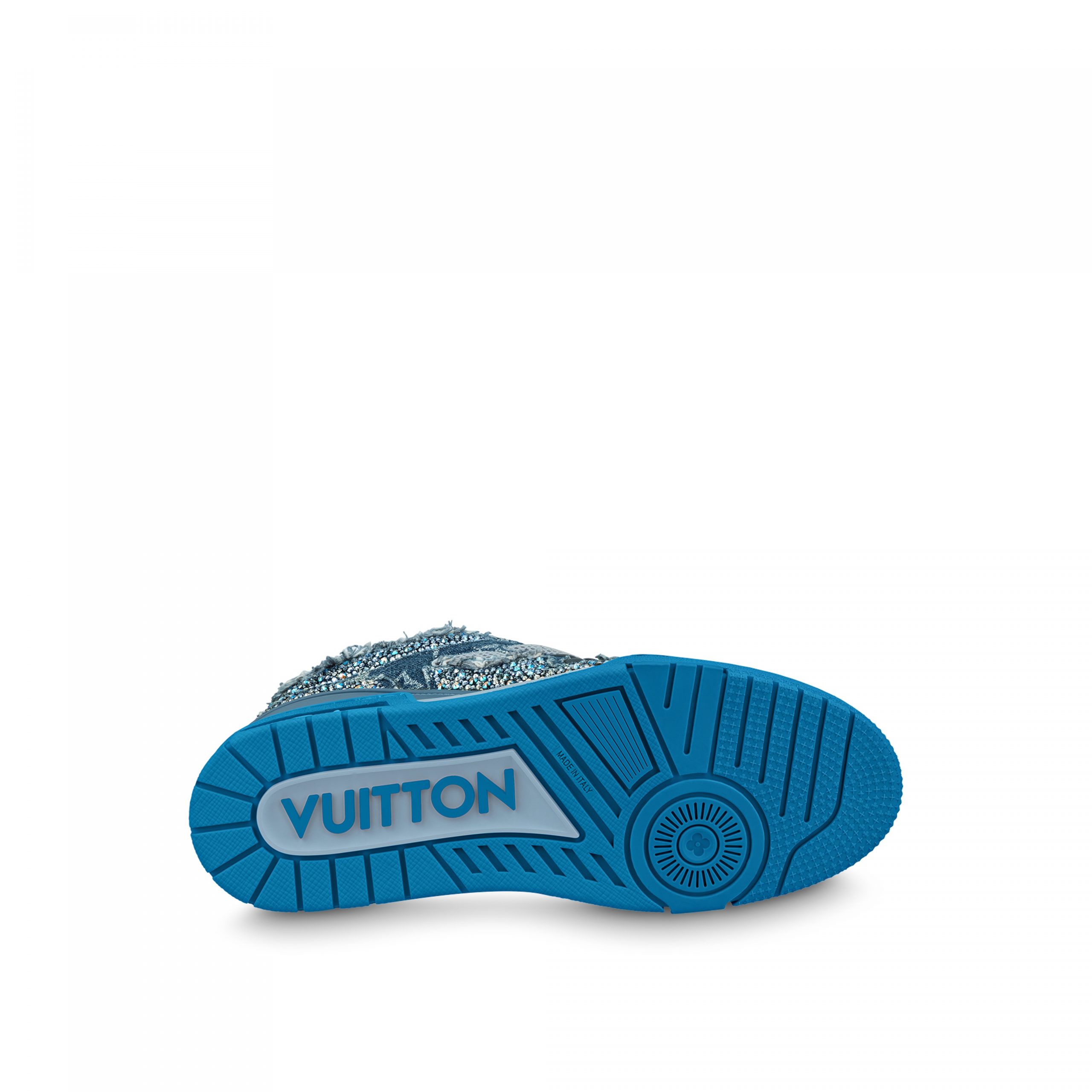 This exceptional edition of the LV Skate sneaker combines Monogram denim with sparkling Swarovski™ crystals and technical mesh. This Nineties-inspired design is characterized by its padded collar and tongue, which features an LV since 54 logo, referring to 1854, when Louis Vuitton was founded. Technical double laces and a bicolor rubber outsole complete this model.