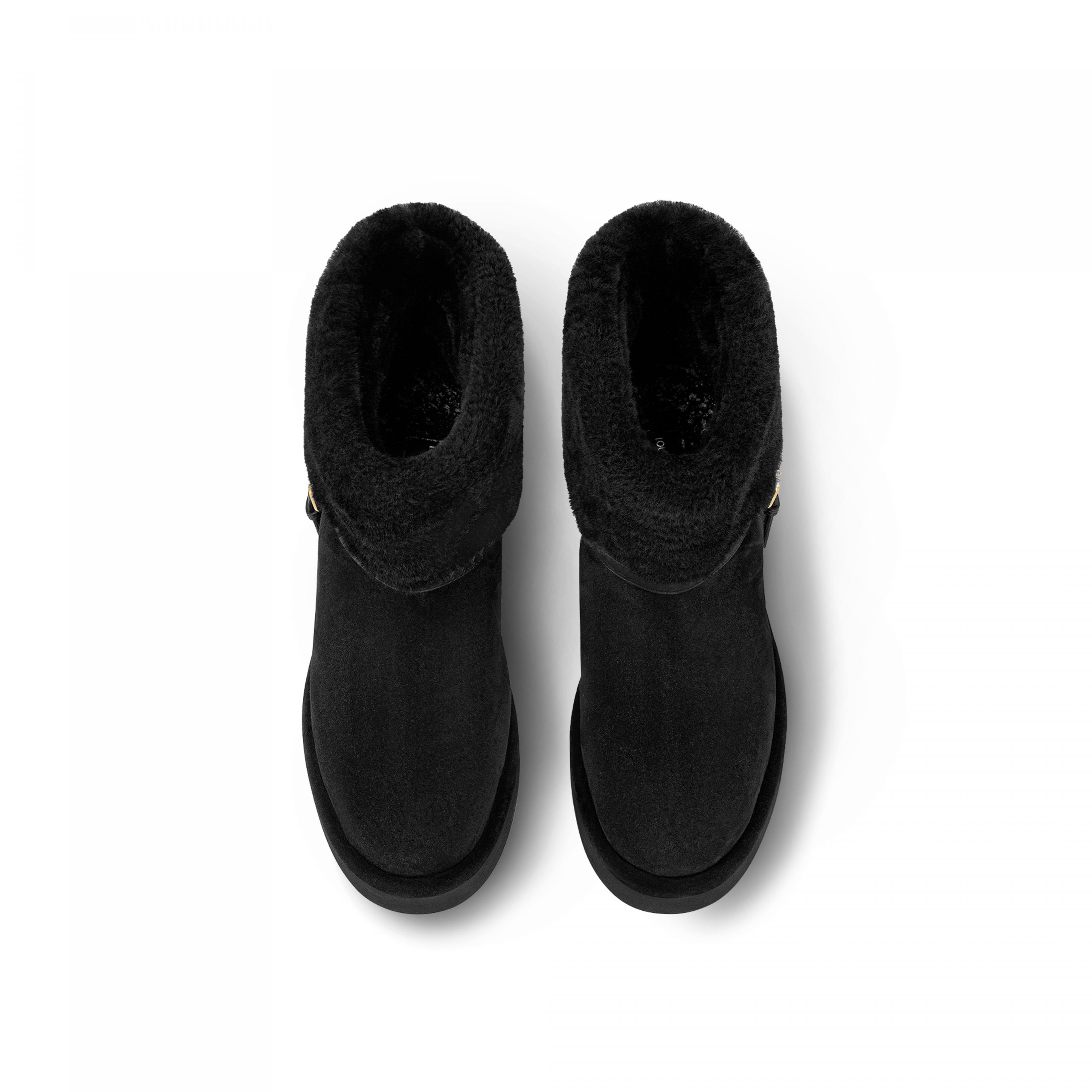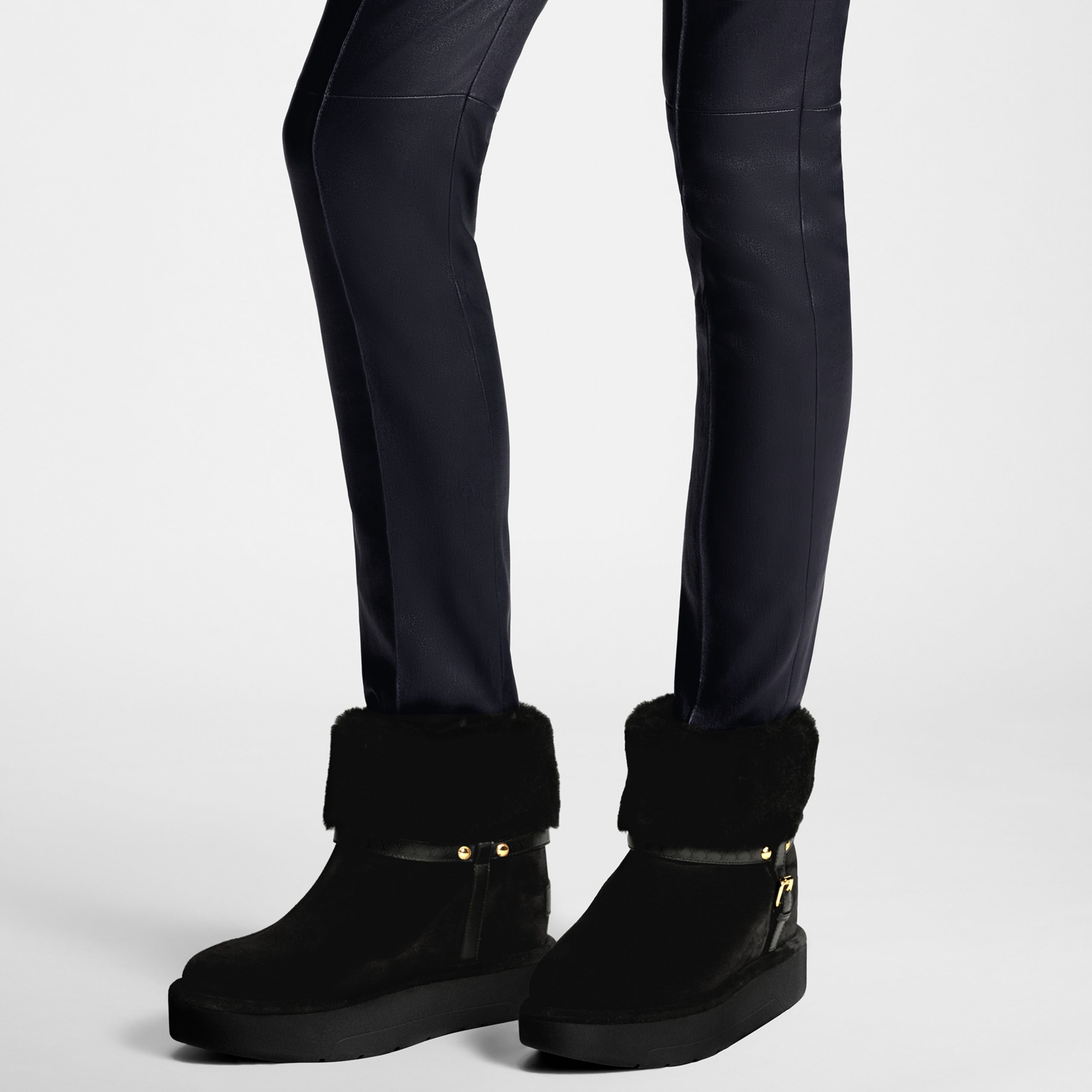 The Aspen platform ankle boot is a winter-ready style with a fashionable après-ski vibe. It comes in velvety suede calf leather with a shearling lining for warmth and softness. The upper is embellished with a leather strap embossed with a row of LV Initials, inspired by the lozine edging of Louis Vuitton trunks.