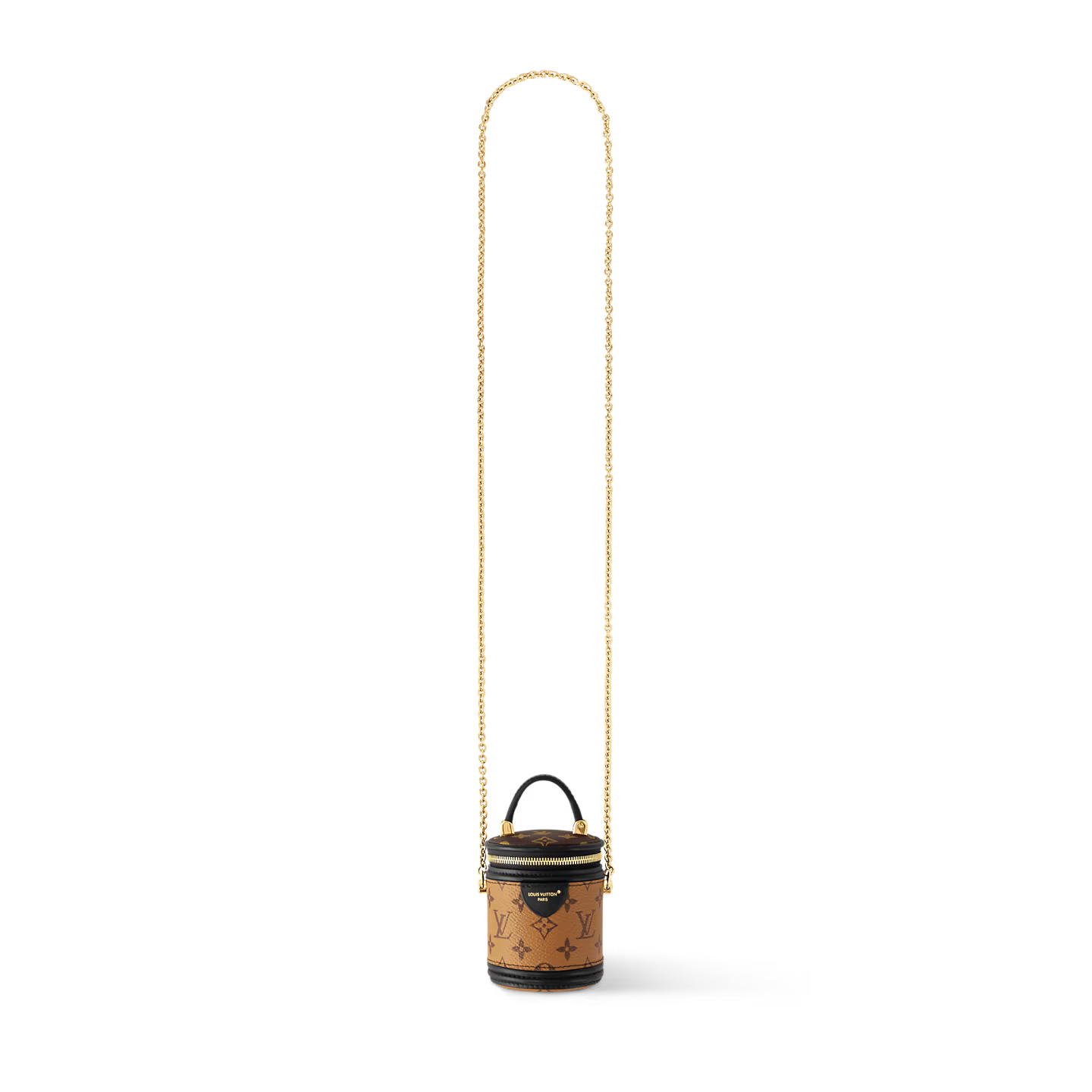 The enchanting Micro Cannes bag charm offers a playful reinterpretation of a historic Louis Vuitton creation. This minutely detailed replica of the Cannes handbag features Monogram canvas accented with gold-toned metal fittings. Adorning a bag handle or worn cross-body with its chain strap, this on-trend, functional charm is perfect for carrying earbuds and other small items.