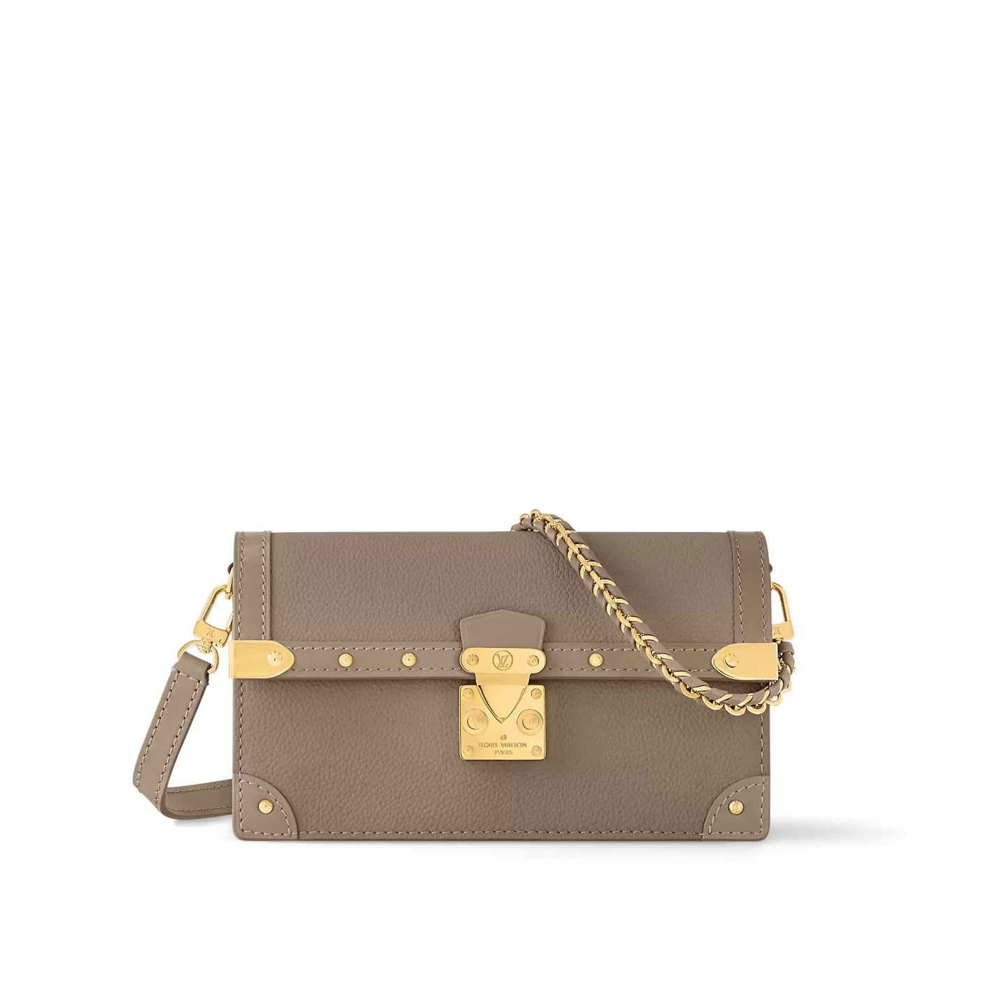 Inspired by Louis Vuitton’s historic trunks, the Trunk chain wallet is a sophisticated, day-to-evening style in supple calf leather. Metal details evoke trunk studs and corners, while the flap is secured with an iconic S-lock. This model has an adjustable shoulder strap and a braided chain, both of which can be removed to transform it into a clutch.