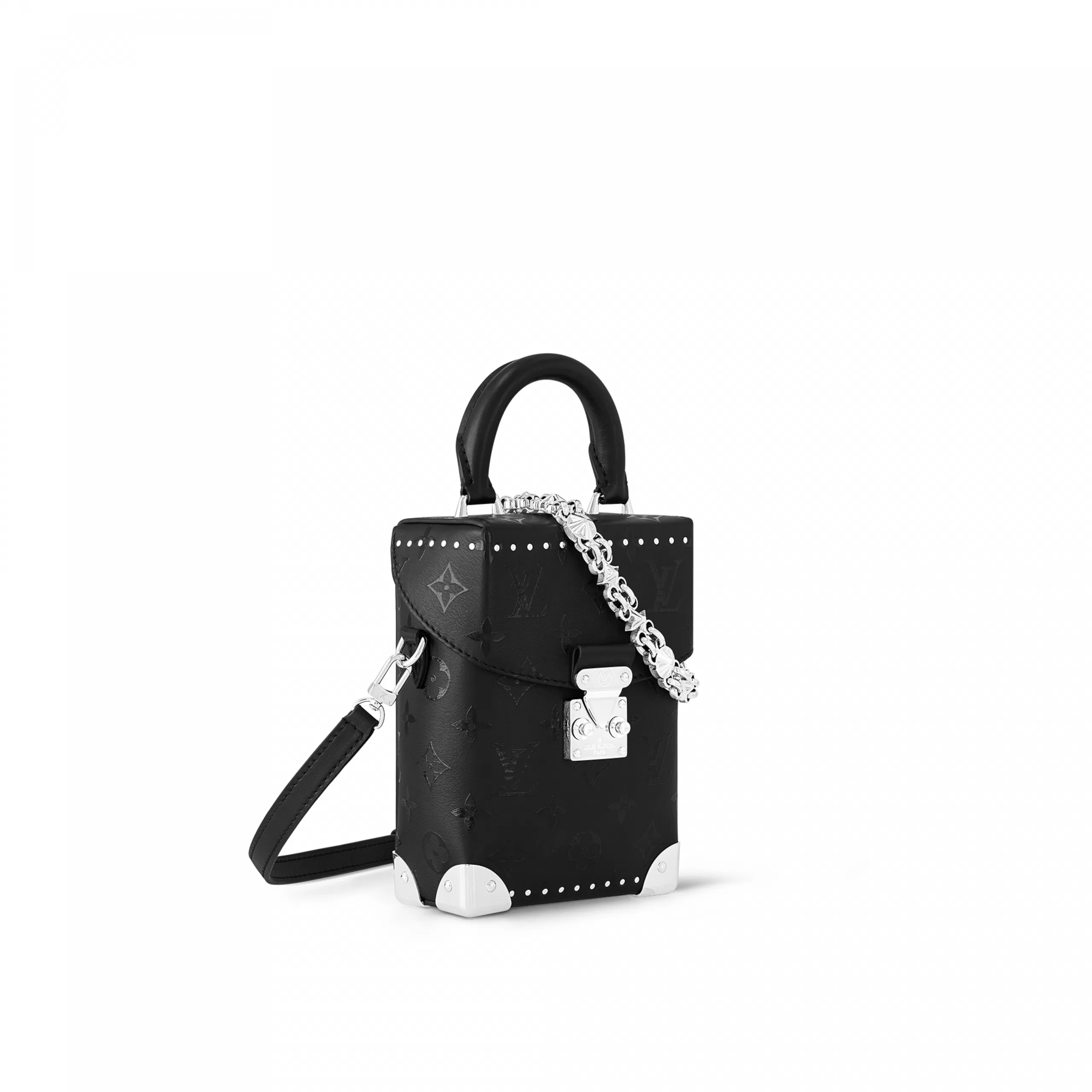 Nicolas Ghesquière’s distinctive Camera Box handbag is made from smooth calfskin, with a black Monogram print. The silver-color, gothic-inspired chain is made of Monogram Flower links, the blossoms reimagined with a rock-and-roll edge. In addition to the chain, there’s an articulated top handle and a detachable and adjustable leather strap.