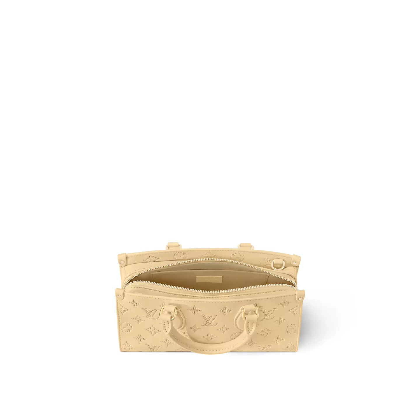 The elegantly elongated silhouette, exquisite calf leather, and subtle pale-yellow colorway all come together to make this OnTheGo East West bag truly eye-catching. It’s signed with a Monogram Flower name tag attached to the handle. Two articulated top handles and a removable chain-and-leather strap give carry options.