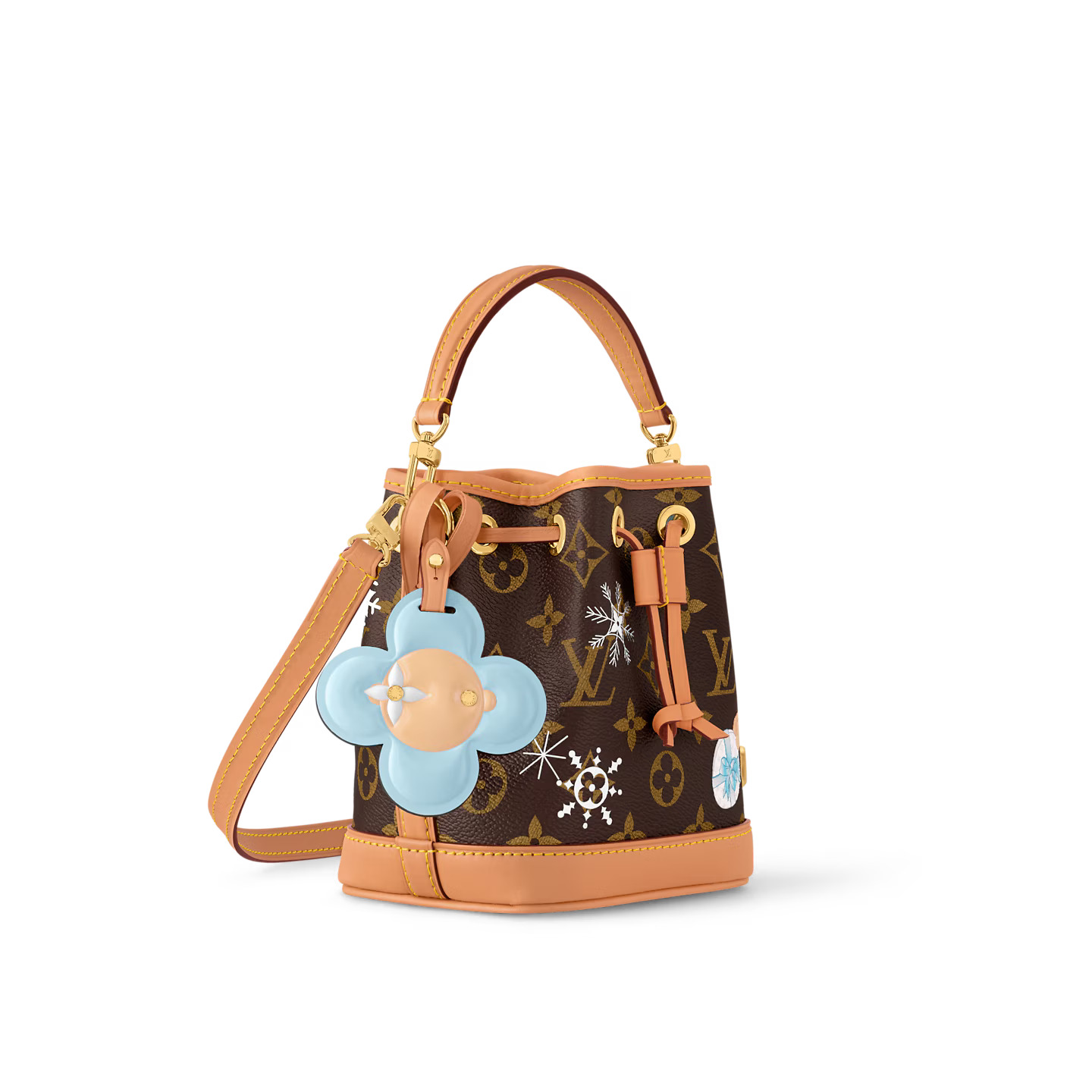 This Snow Show edition of the Nano Noé celebrates the festive season and welcomes the return of the iconic Vivienne mascot. Crafted from signature Monogram canvas, the style exudes a sense of fun and magic with illustrations of the adorable character playing with LV snowflakes. It is finished with a Vivienne-shaped leather charm, which can be removed if desired.