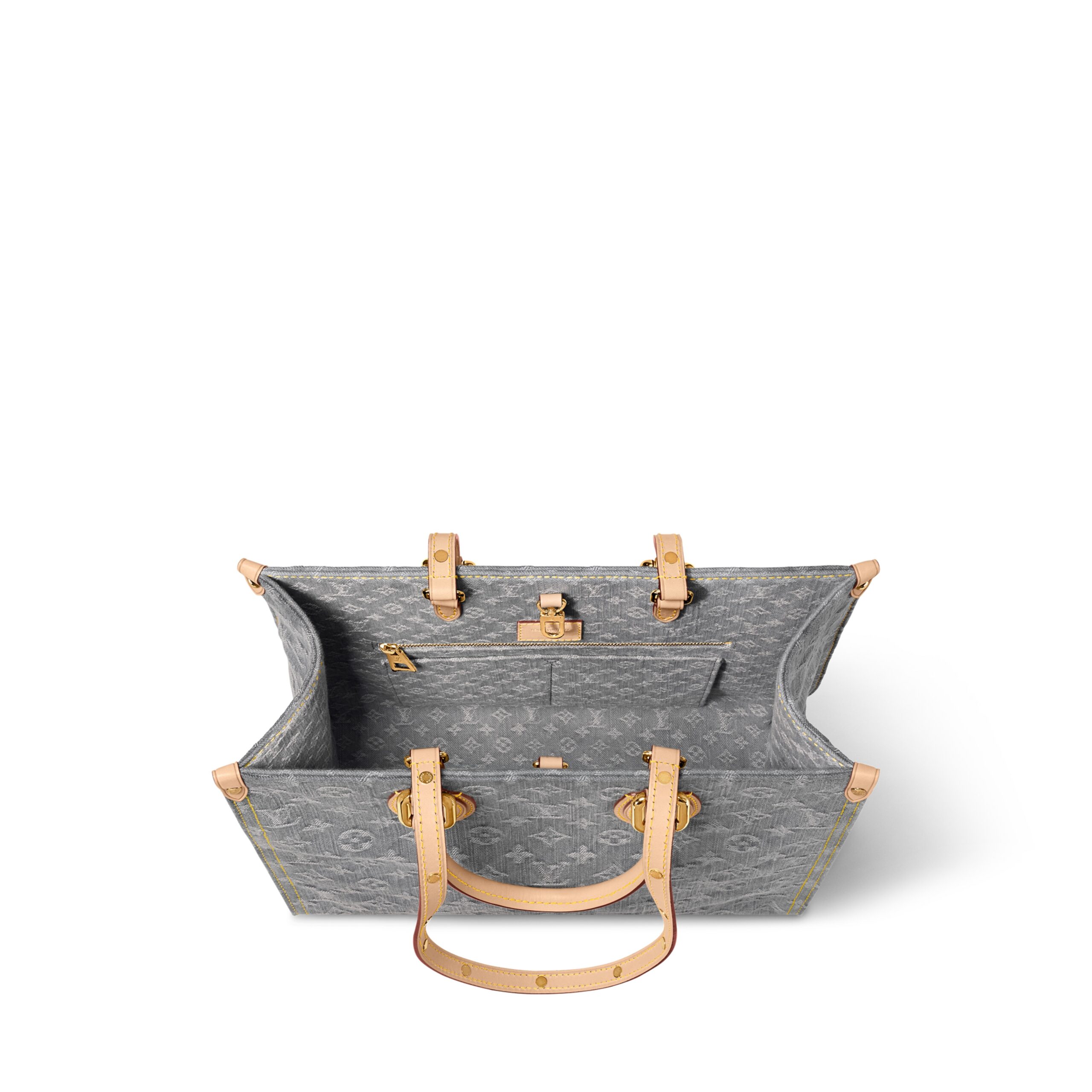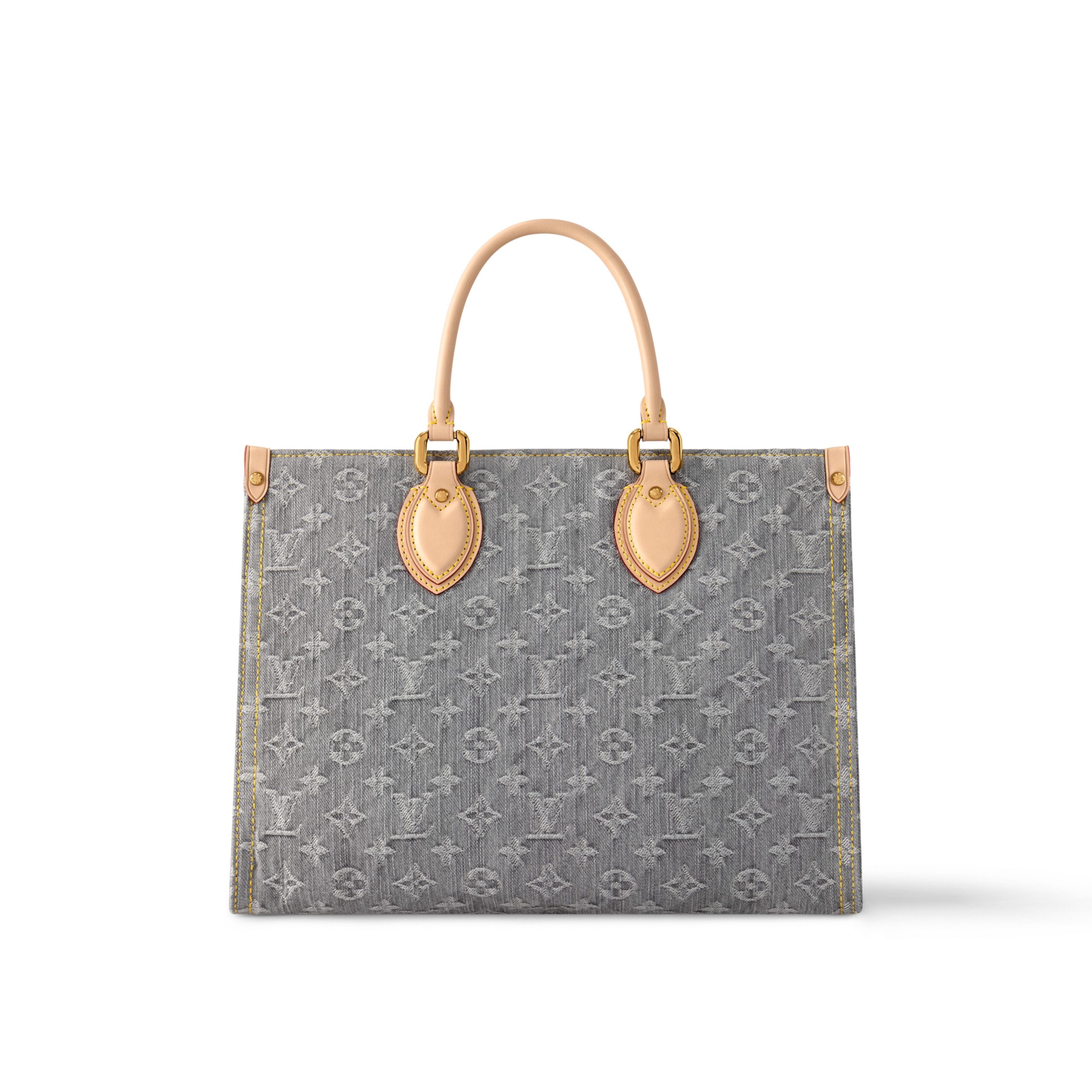 This edition of the OnTheGo MM celebrates the return of the iconic Monogram Denim pattern from 2005. It is crafted from organic cotton that is skillfully woven with black and white threads, then bleached using a special Louis Vuitton technique to create a vintage-inspired finish. Sized to store a laptop, it is elevated with light gold-toned hardware and includes signature details such as the natural leather trims and a removable name tag.