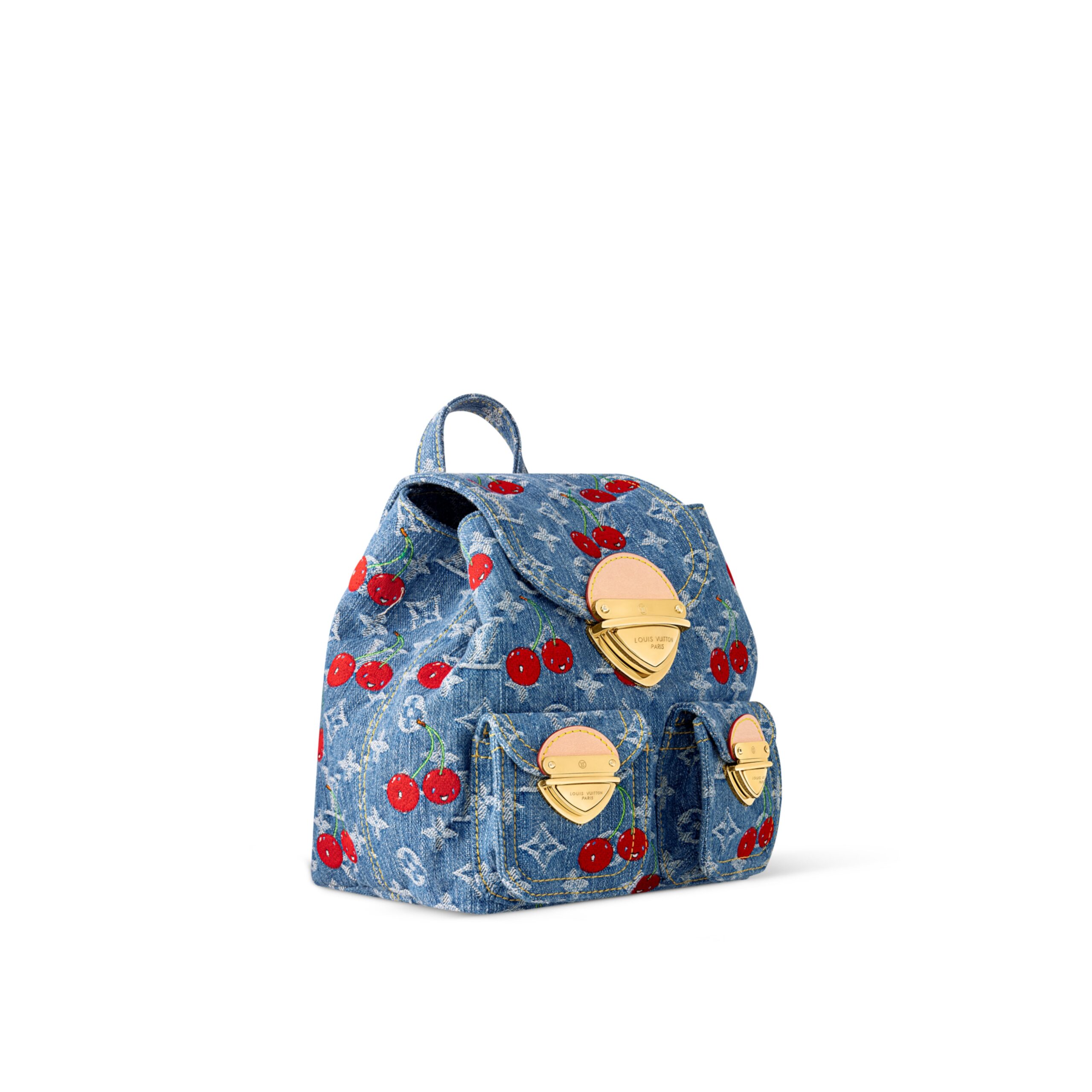 The Venice backpack is playfully revisited as part of the joyful re-edition of the Louis Vuitton x Murakami collection. It is crafted from Monogram denim detailed with statement embroidered cherry motifs in the Japanese artist’s signature colorful aesthetic. The slim straps are highlighted in natural leather, while the flap and two outside pockets are finished with chunky golden tuck locks.