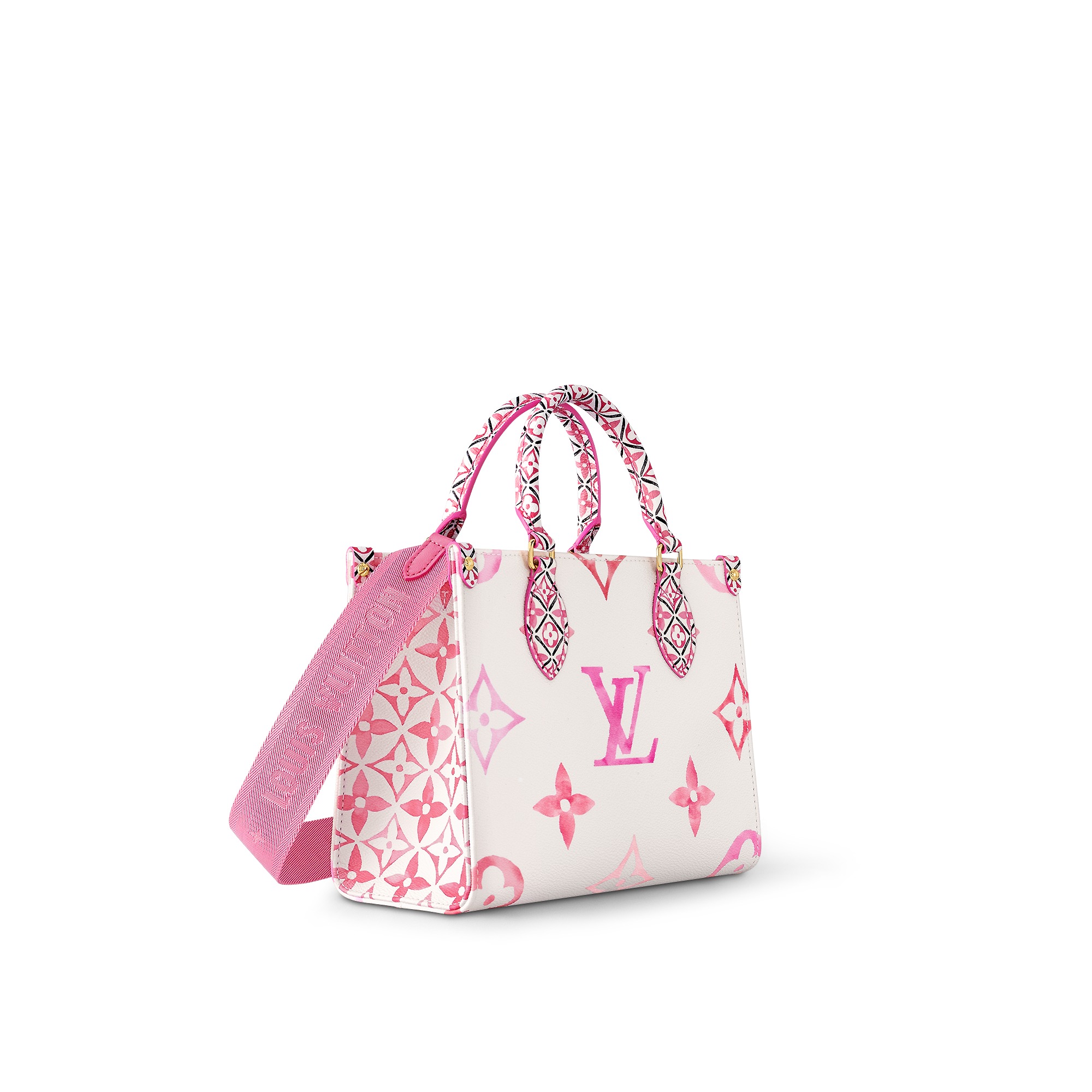 The OnTheGo PM is a handbag-sized tote in cream-color canvas with a pastel-color Giant Monogram pattern. The pattern is paired with trim and top handles in a dense motif of Monogram Flowers inspired by the traditional azulejo ceramics of Portugal. A removable and adjustable strap enables shoulder wear.