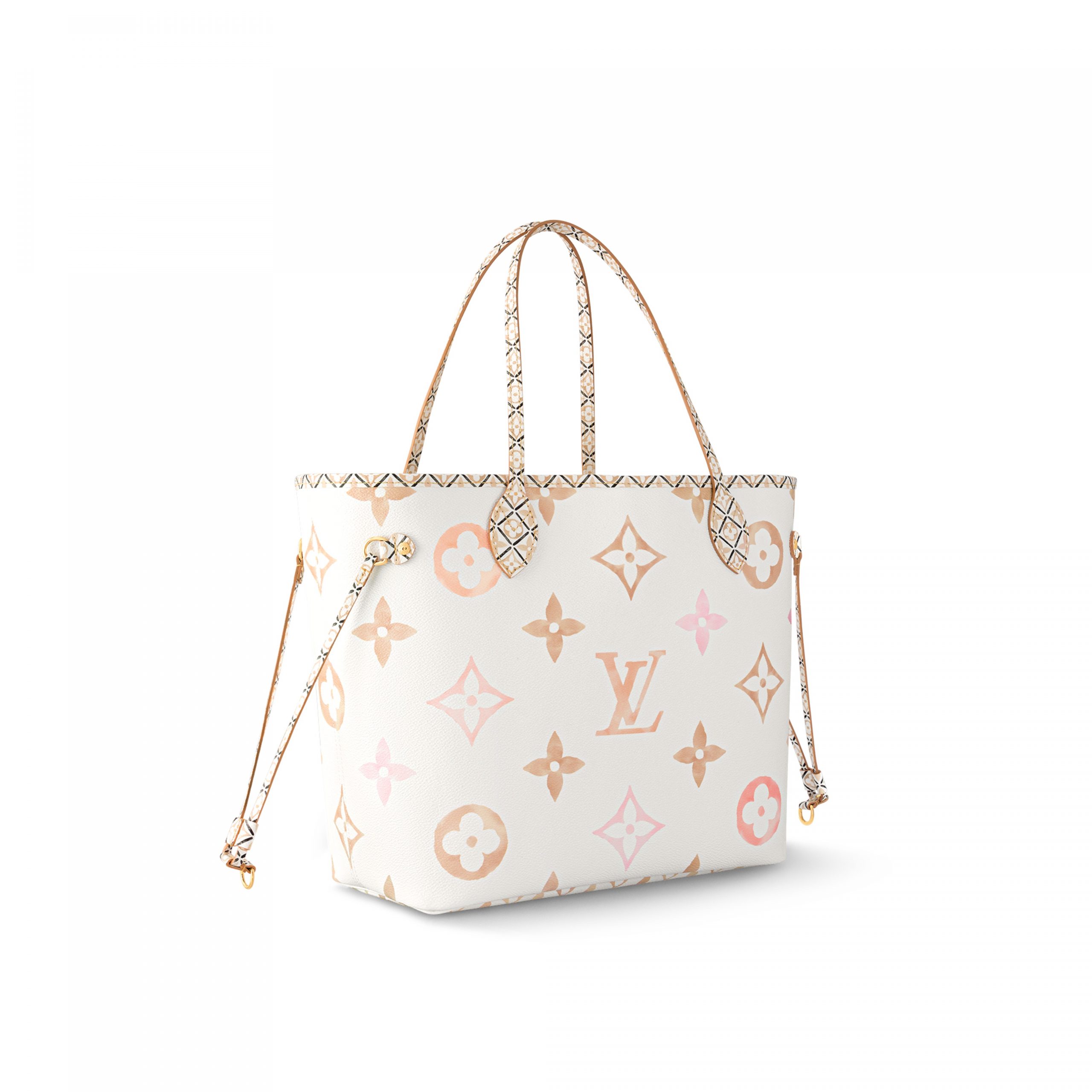 The Neverfull MM tote is summer-ready in cream-color canvas with a Giant Monogram pattern in pastel. The LV’s and Monogram Flowers are rendered irregularly, as if in watercolor, and are perfectly complemented by the dense Monogram Blossom print on the trim along the top of the bag and on the handles and their mounts.