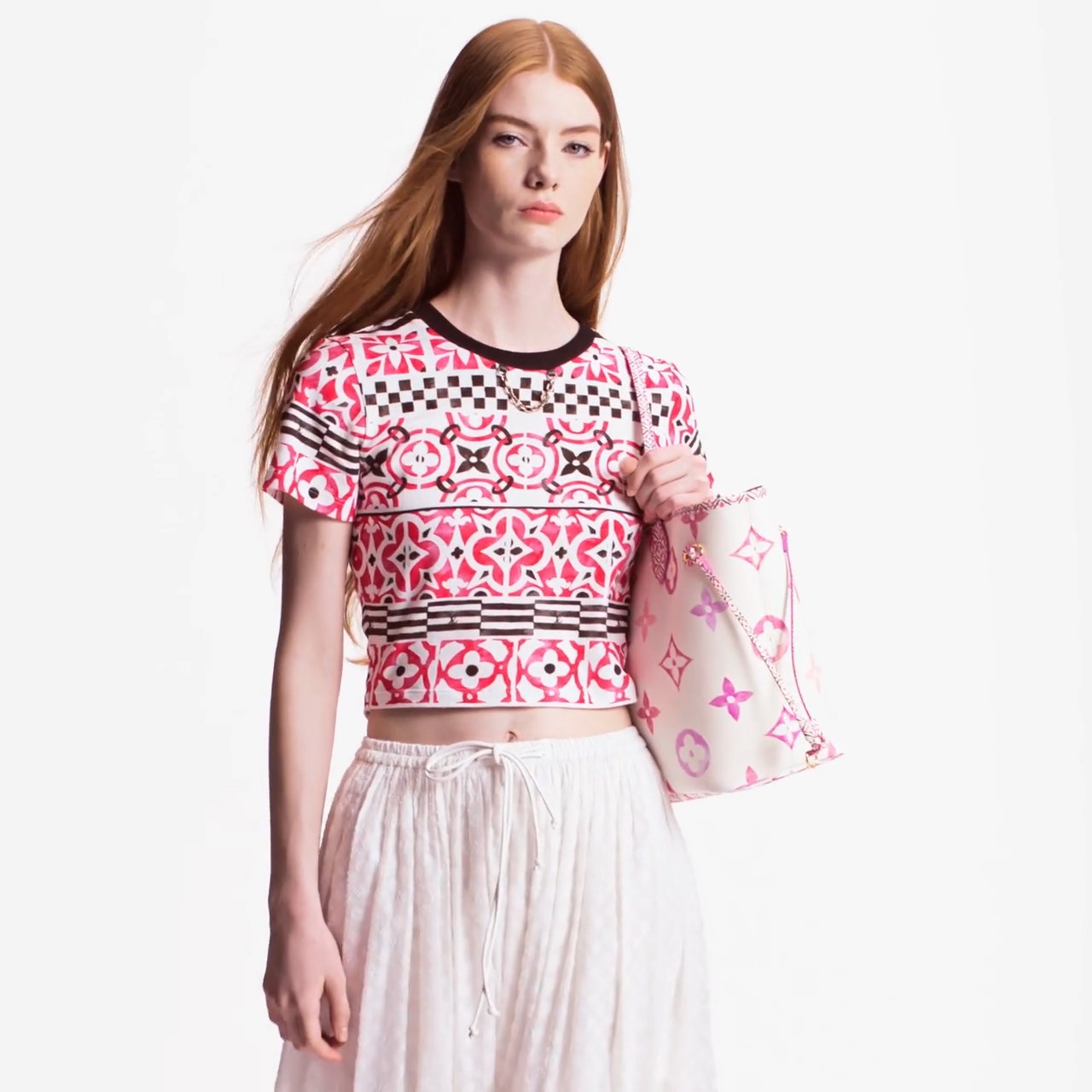 The Neverfull MM tote is summer-ready in cream-color canvas with a Giant Monogram pattern in pastel. The LV’s and Monogram Flowers are rendered irregularly, as if in watercolor, and are perfectly complemented by the dense Monogram Blossom print on the trim along the top of the bag and on the handles and their mounts.