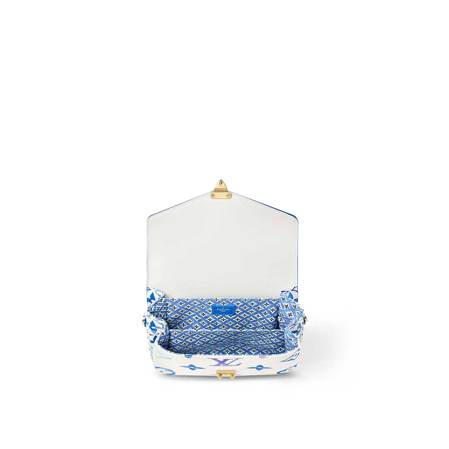 The Pochette Metis handbag is made from cream-color canvas with pastel LV’s and Monogram Flowers printed with a delicate watercolor effect. The top handle and removable strap feature a denser pattern of the Monogram Flowers, reminiscent of the painted ceramic tilework found in Lisbon.