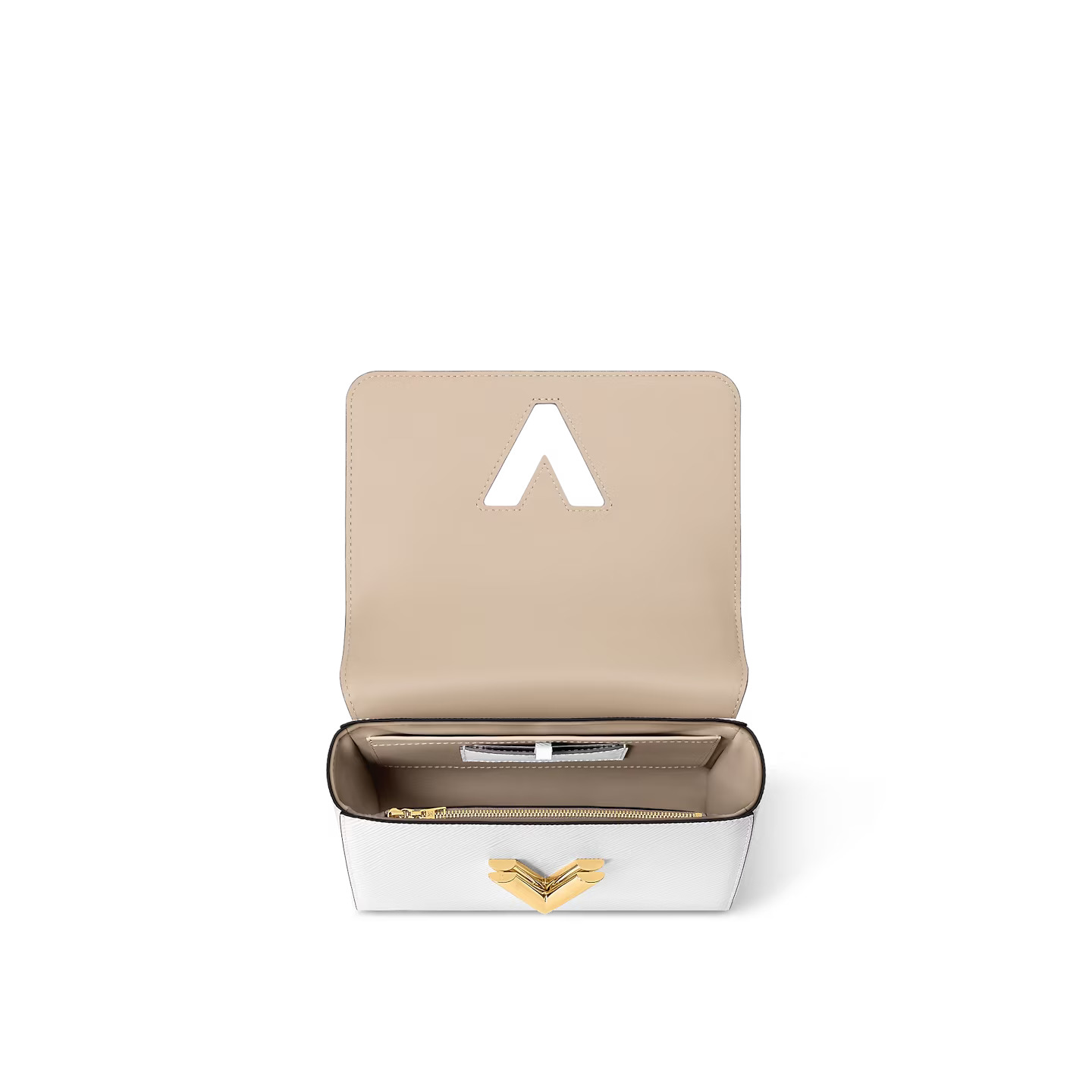 The Twist MM handbag looks stunning in white calfskin with a gold-color Louis Vuitton Twist lock and a leather charm inspired by the street signs of Paris. The detachable strap is in the same colorway as the charm and features “Louis Vuitton Paris” in white lettering. A removable leather top-handle gives another carry option.