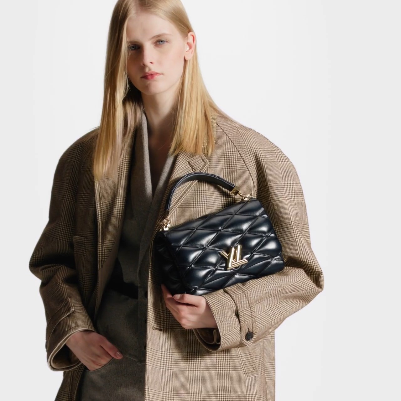 Nicolas Ghesquière explores new techniques to embellish the GO-14 MM handbag. Here padded lambskin is quilted, and a refined toasted effect is applied by hand, giving it an edgy aspect. The top handle and adjustable chain – both detachable – enable carry options. It’s signed with the House’s emblematic LV Twist lock.