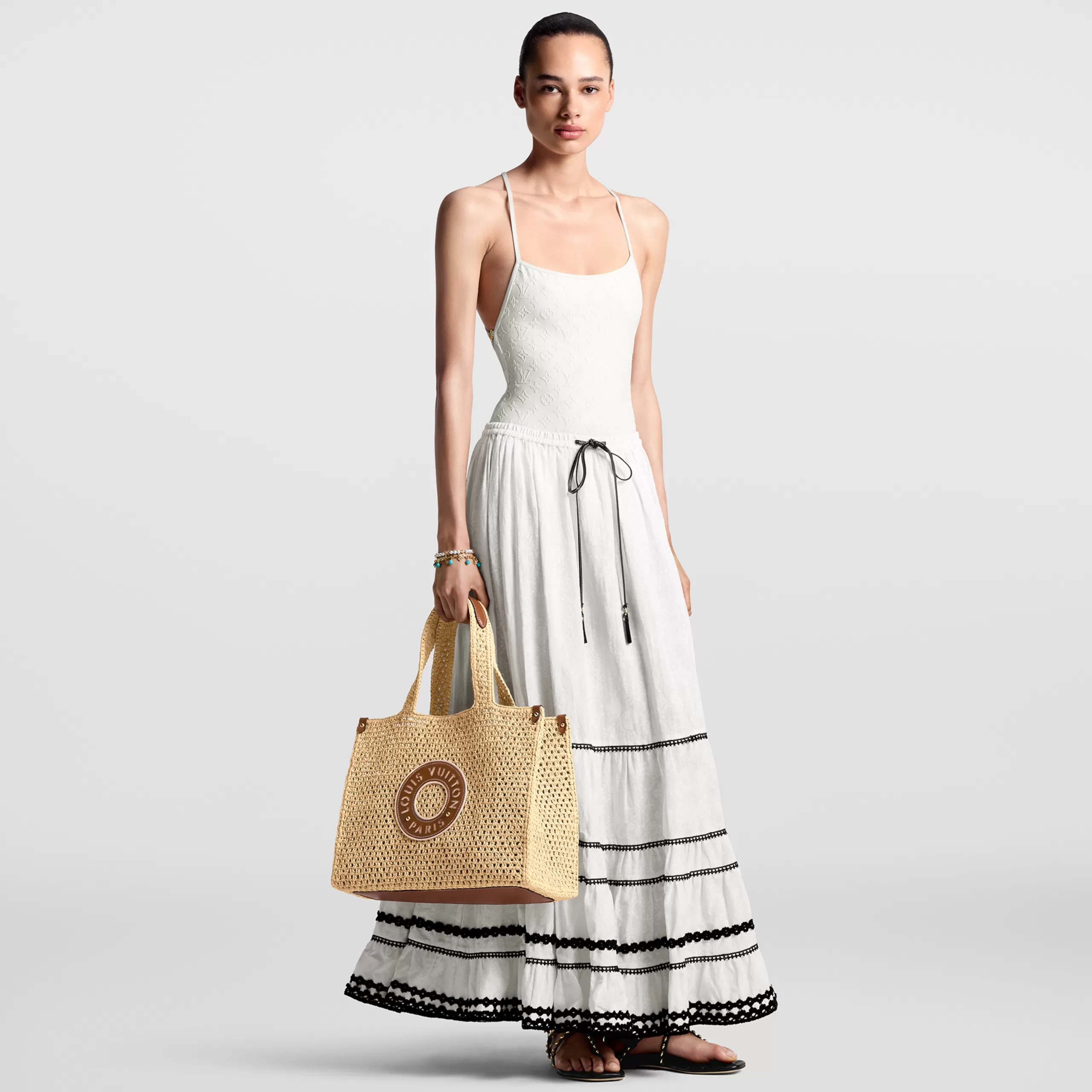 As part of the LV By The Pool Collection, the OnTheGo MM tote is made from hand-crocheted 100% natural raffia. The riveted corners are in cowhide leather, as is the circular “Louis Vuitton Paris” patch on the front. The OnTheGo MM can fit 13-inch laptop and a beach towel as well other essentials.