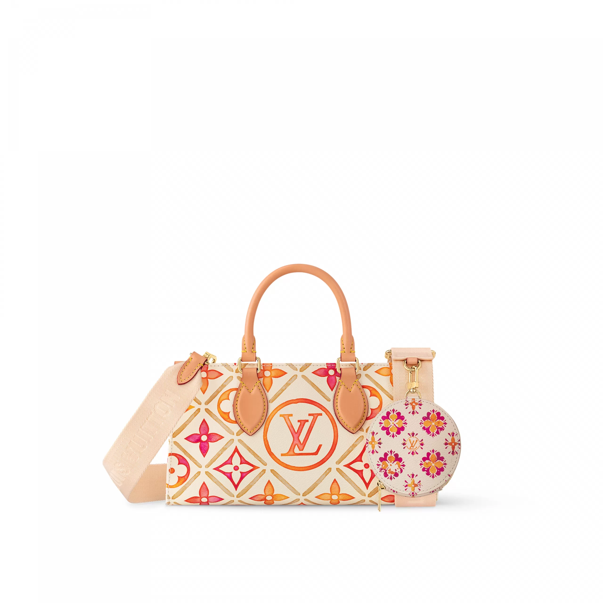 Its striking, stretched shape and Monogram Tiles canvas make this OnTheGo East West handbag one of the stars of the LV By The Pool Collection. The irregular pastel treatment of the LV Circle and Monogram Flowers conjure dreams of faraway shores. A wide, detachable strap means it can be styled in a variety of ways.