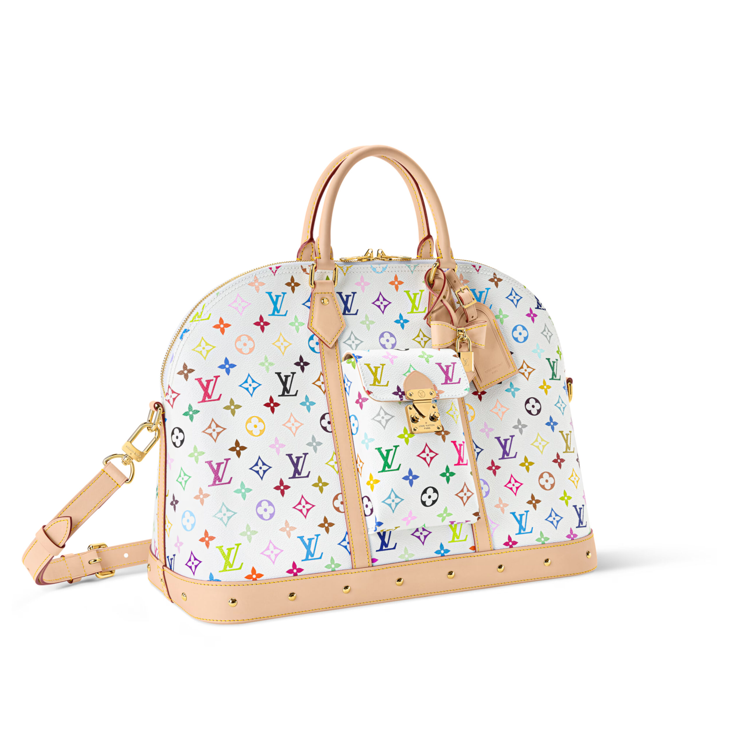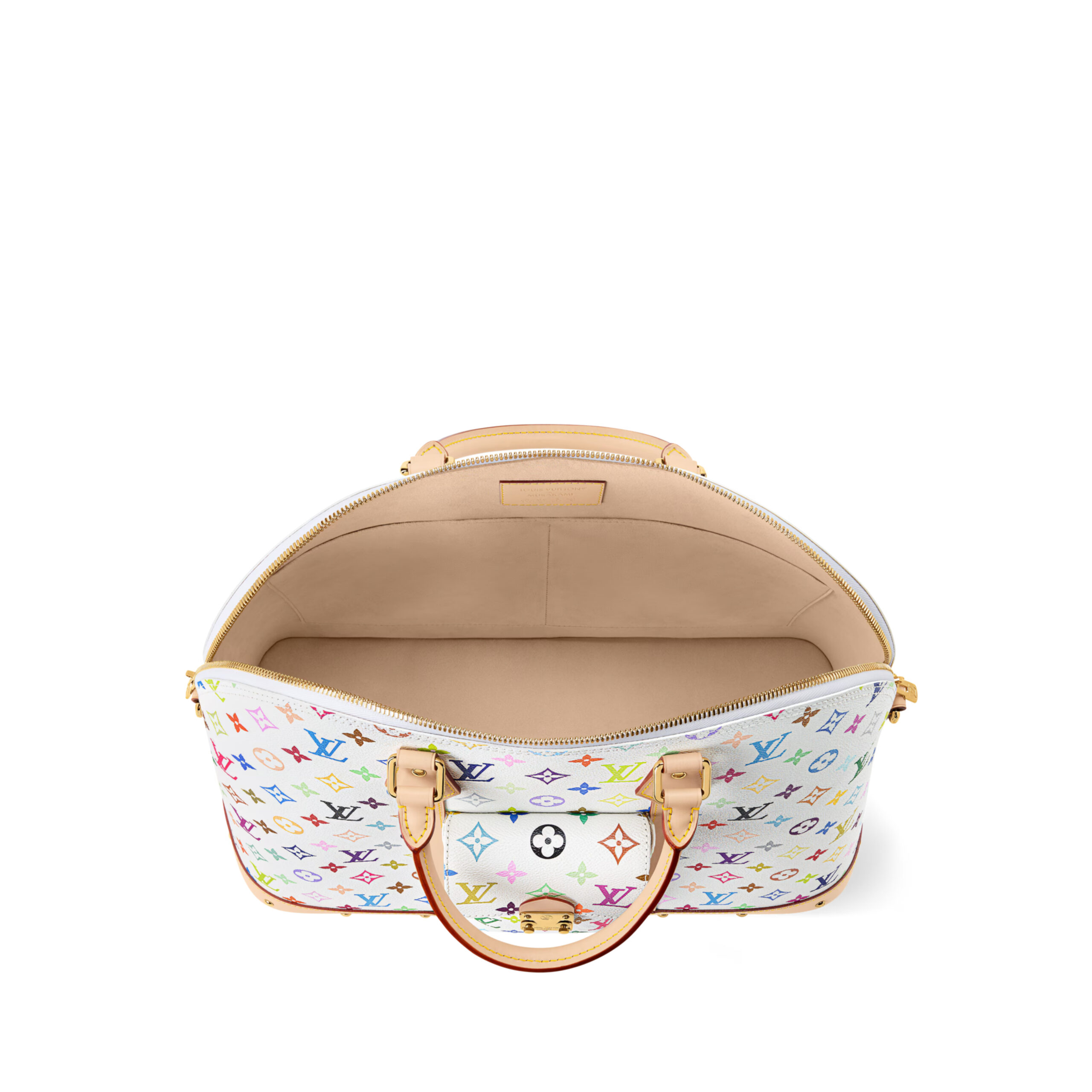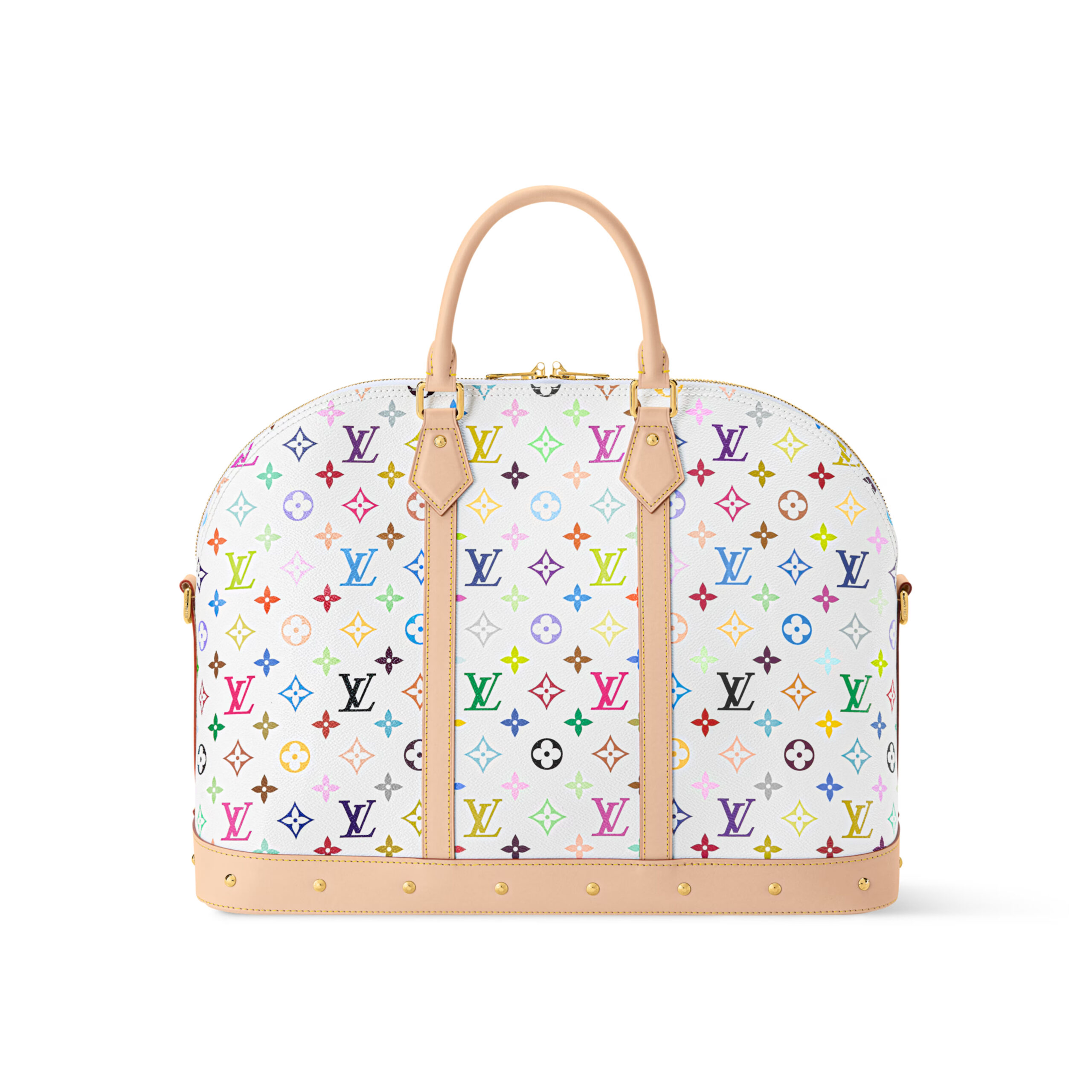The Alma Travel bag’s distinctive silhouette embraces a pop-art spirit in Monogram Multicolore coated canvas. Originally created by Takashi Murakami for the House in 2003, this multihued variation on the Monogram motif includes 33 distinct colors. Lined in cream-colored microfiber, it’s finished with natural cowhide trim and golden hardware, including riveted accents.
