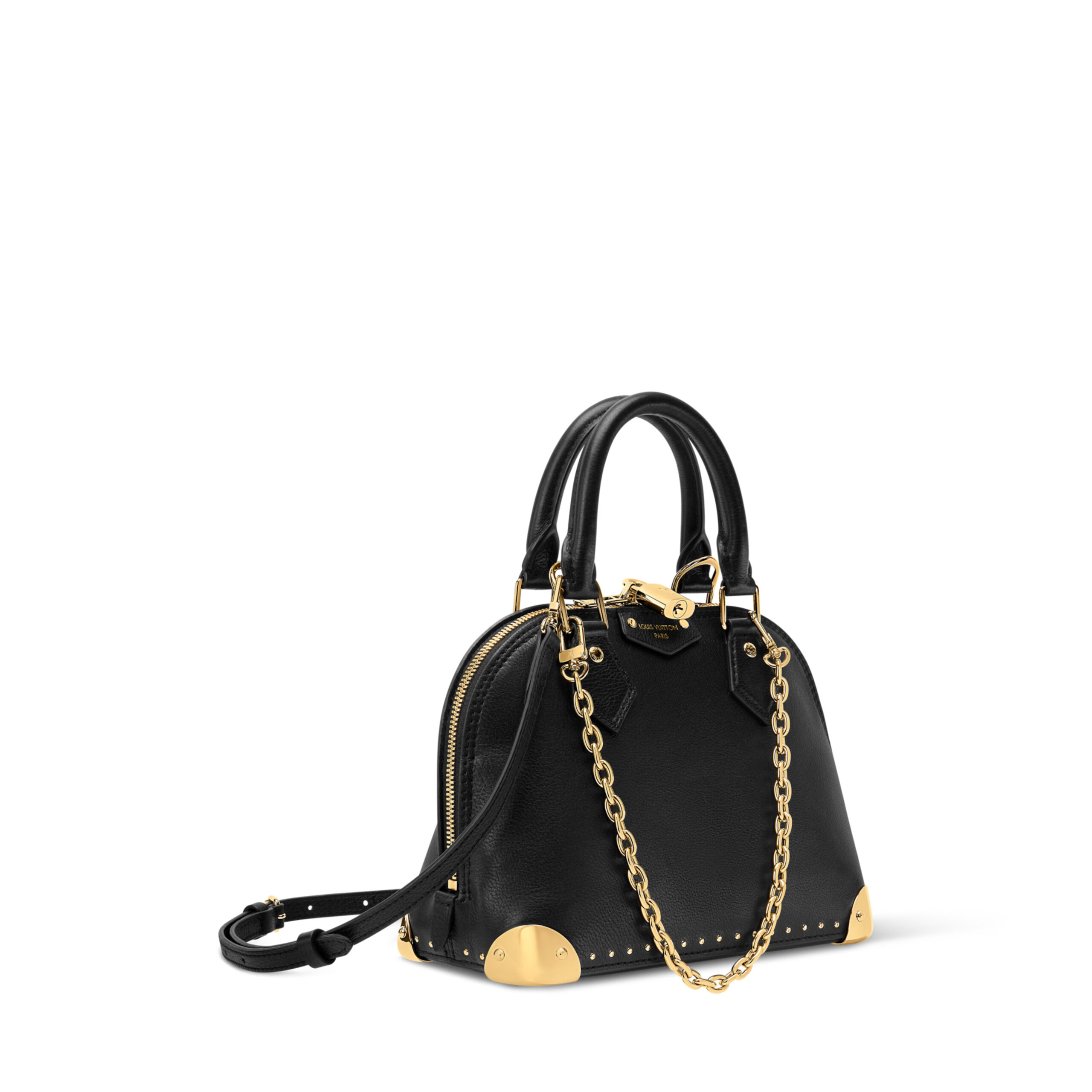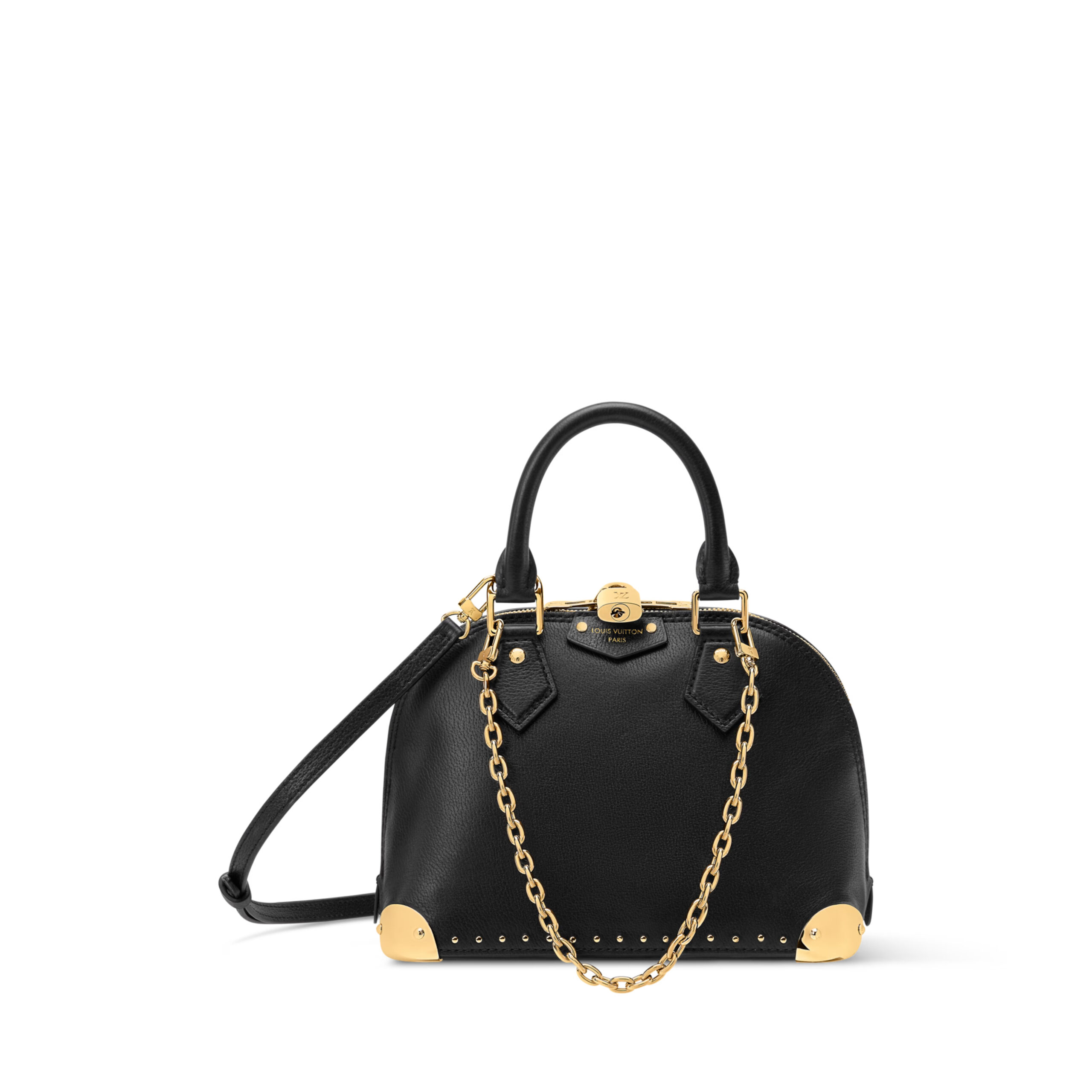 This edition of the Alma Trunk BB, is offered in a timeless smooth calfskin. It is defined by its gleaming gold-toned hardware, from the signature padlock to the trunk-inspired corners and decorative chain. Elegant and functional, it is sized to fit daily essentials and includes a flat pocket to keep a cardholder or smaller items secure.