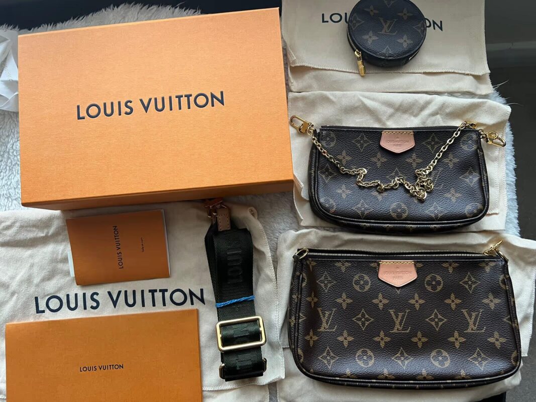 The Multi Pochette Accessoires is a hybrid cross-body bag with multiple pockets and compartments that brings together a Pochette Accessoires, a Mini Pochette Accessoires and a Round Coin Purse. Fashioned from Monogram canvas with a mini Monogram pattern on the sides of the two pochettes, it has both a removable gold-tone chain and an adjustable Louis Vuitton inscribed Jacquard strap for multiple carrying options.