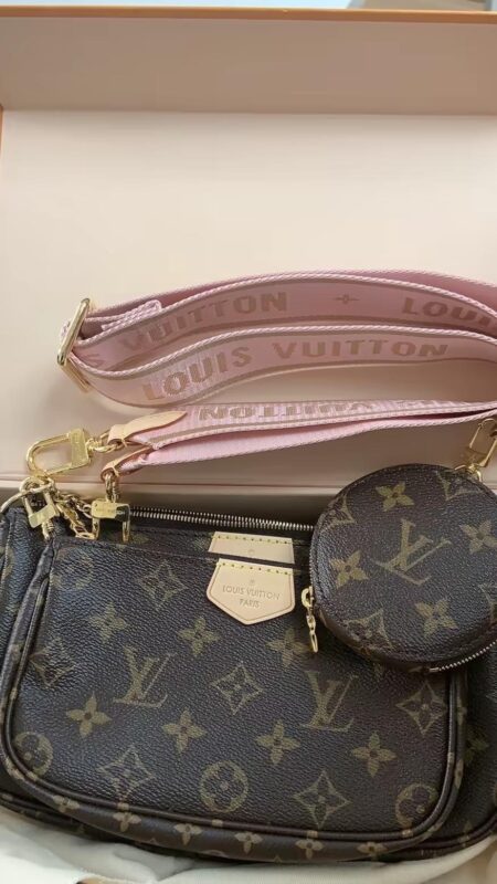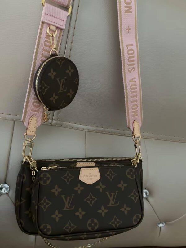 The Multi Pochette Accessoires is a hybrid cross-body bag with multiple pockets and compartments that brings together a Pochette Accessoires, a Mini Pochette Accessoires and a Round Coin Purse. Fashioned from Monogram canvas with a mini Monogram pattern on the sides of the two pochettes, it has both a removable gold-tone chain and an adjustable Louis Vuitton inscribed Jacquard strap for multiple carrying options.