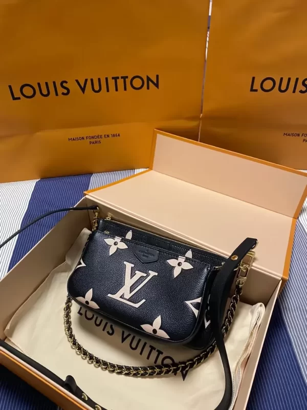 The Multi Pochette Accessoires cross-body bag takes on a striking aspect in embossed black Monogram Empreinte leather, overprinted with the Monogram motif in a cream color. Just the right size to carry a woman’s essentials, this two-in-one bag keeps things organized with its removable pouches. It’s comfortable to wear thanks to its suppleness and light weight.