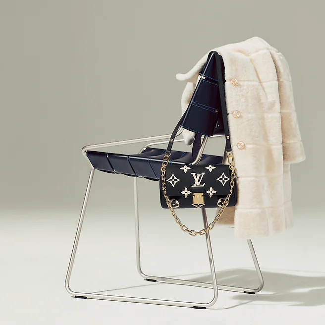 The Favorite is a fashionable baguette shoudler bag made from supple grained leather with an oversized embossed Monogram pattern. Feminine pleats bring a couture touch while the gold-color magnetic lock evokes Louis Vuitton’s heritage. A removable and adjustable strap enables short-shoulder carry or cross-body wear while a blod detachable gold-color chain allows more glamorous evening use.