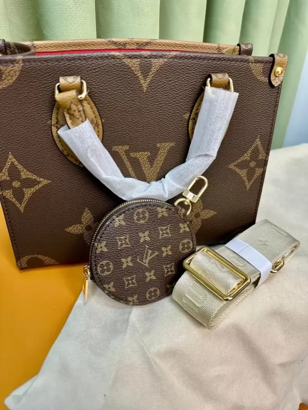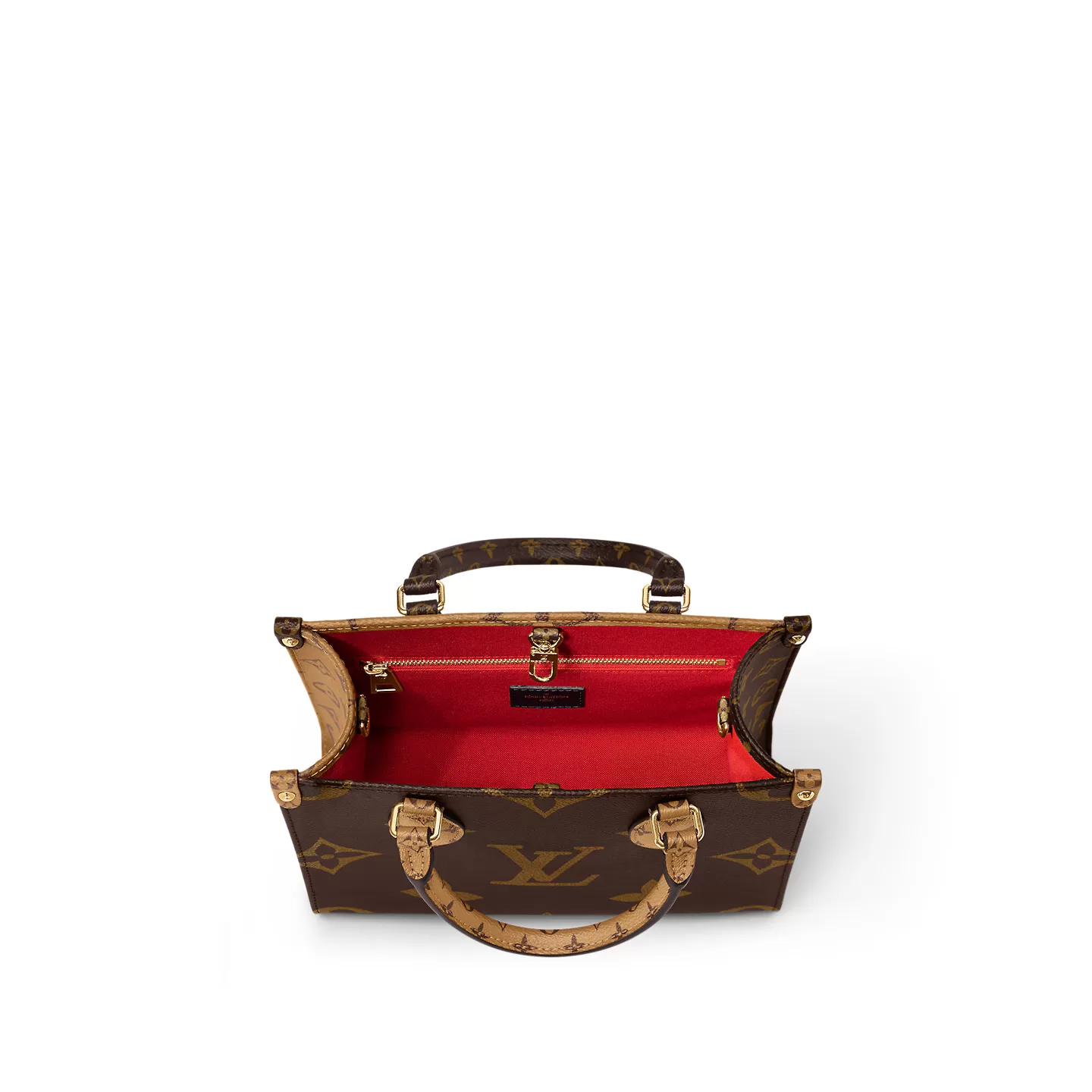 Both fashionable and functional, this OnTheGo PM tote is an ideal everyday companion. Made from a mix of Monogram and Monogram Reverse canvas with the on-trend Giant pattern, it is fitted with Toron handles and a signature woven jacquard strap in contrasting crème beige. The detachable coin purse is perfect for storing change or tiny treasures.