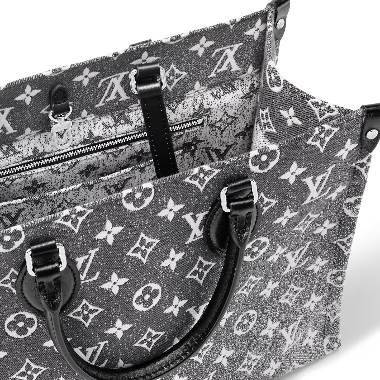 This season, the OnTheGo MM tote is offered in new Monogram Jacquard Denim, a pattern first seen on the Cruise 2023 runway. Woven specifically to obtain a raw, stone-washed effect, the gray jacquard lends the bag a modern allure. Lined with reverse Monogram, this roomy, versatile piece is finished with black-leather trim and silver-color hardware.