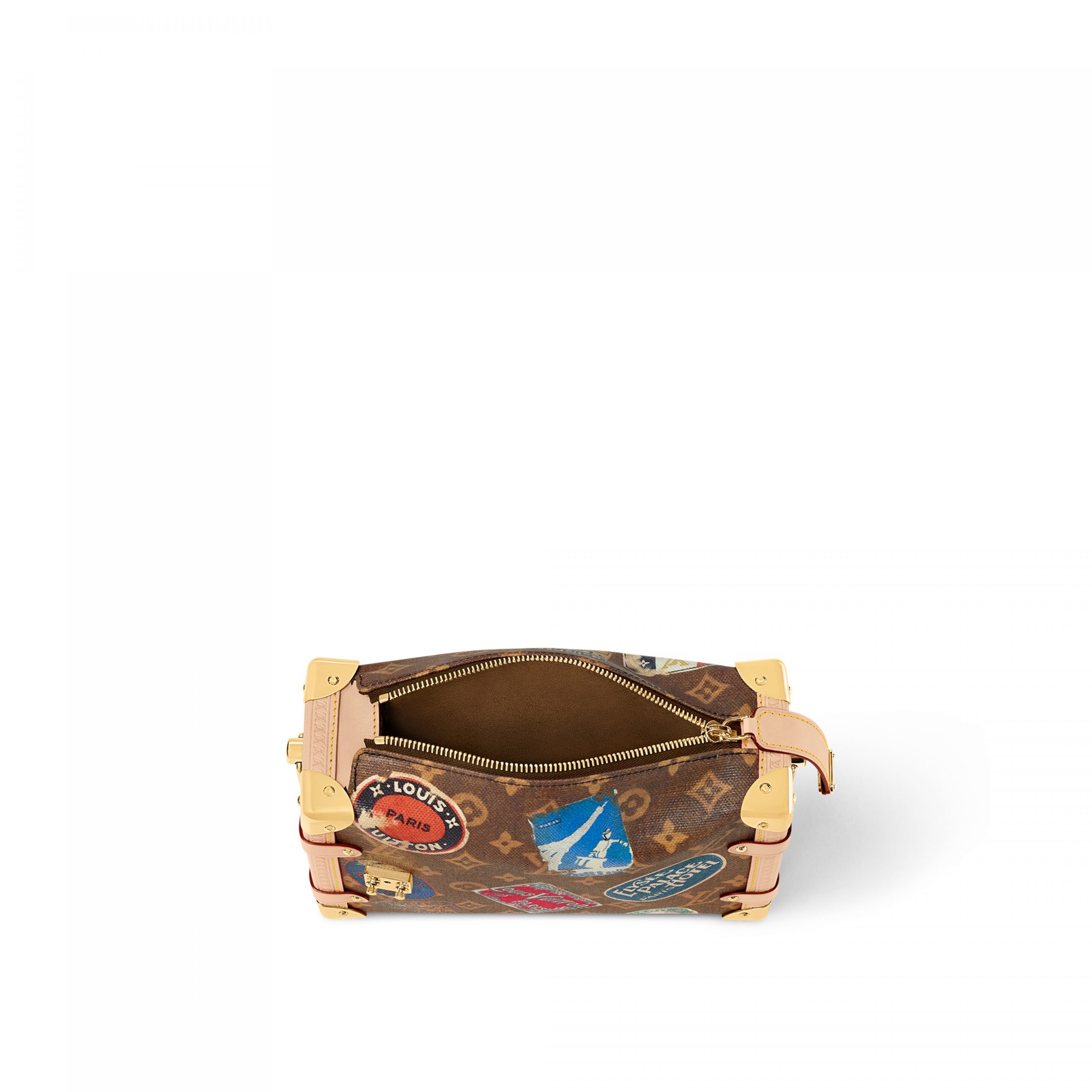From the Spring-Summer 2024 show comes this Side Trunk MM handbag. It is inspired by the Maison’s archive-trunk Monogram canvas, made of a blend of cotton and linen glazed with resin for a superbly soft hand. Decorated with hotel labels that pay tribute to Gaston-Louis Vuitton’s fabulous collection, the bag is trimmed in heritage natural cowhide-leather. Both handle and strap are removable.