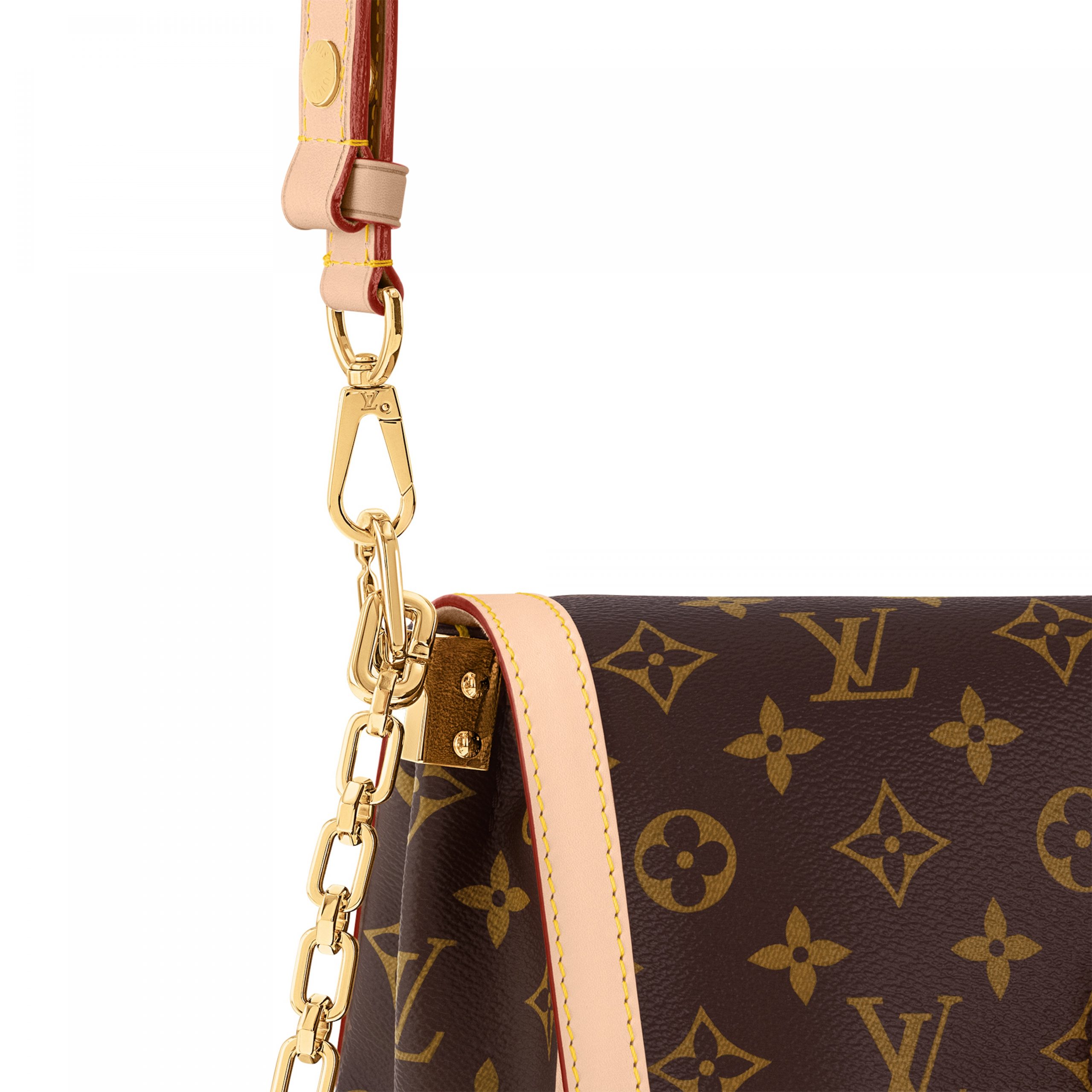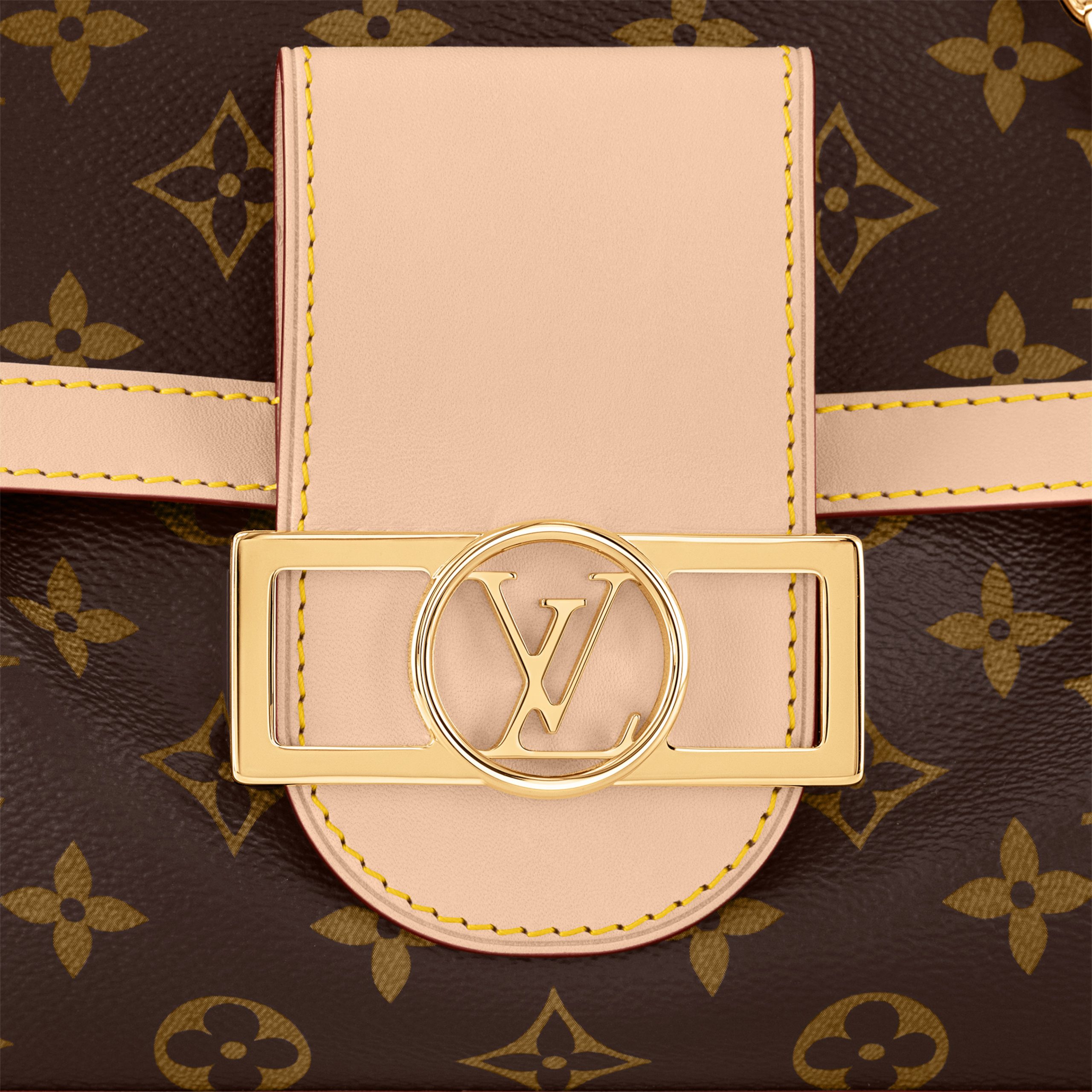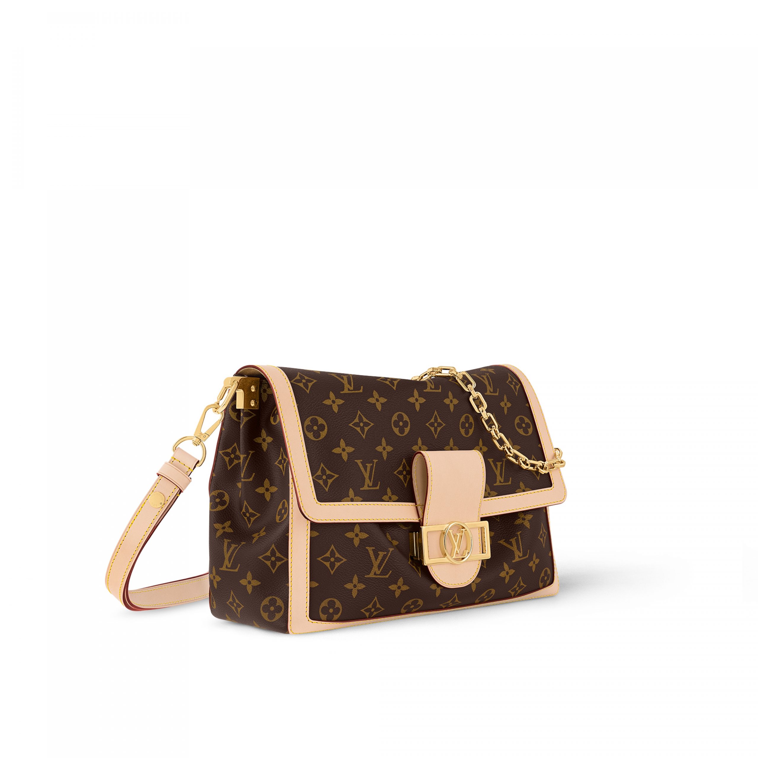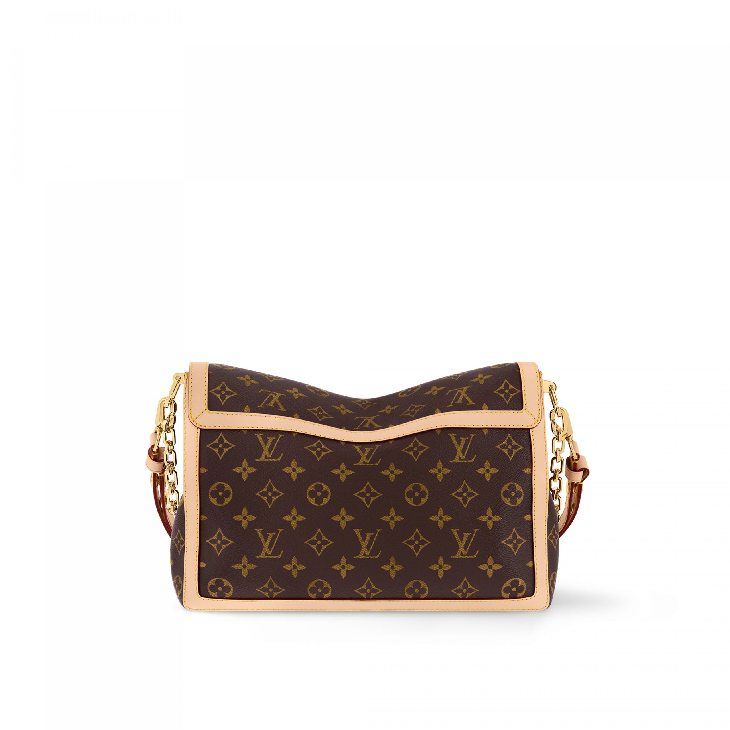This large Dauphine Soft handbag, crafted from Monogram canvas for a soft structure, debuted at the Spring/Summer 2024 show. Complemented with leather trim for comfortable hand-carrying, it features all the classic elements of the Dauphine handbag, including the LV Circle logo on the rectangular clasp, along with a removable chain strap and shoulder strap.