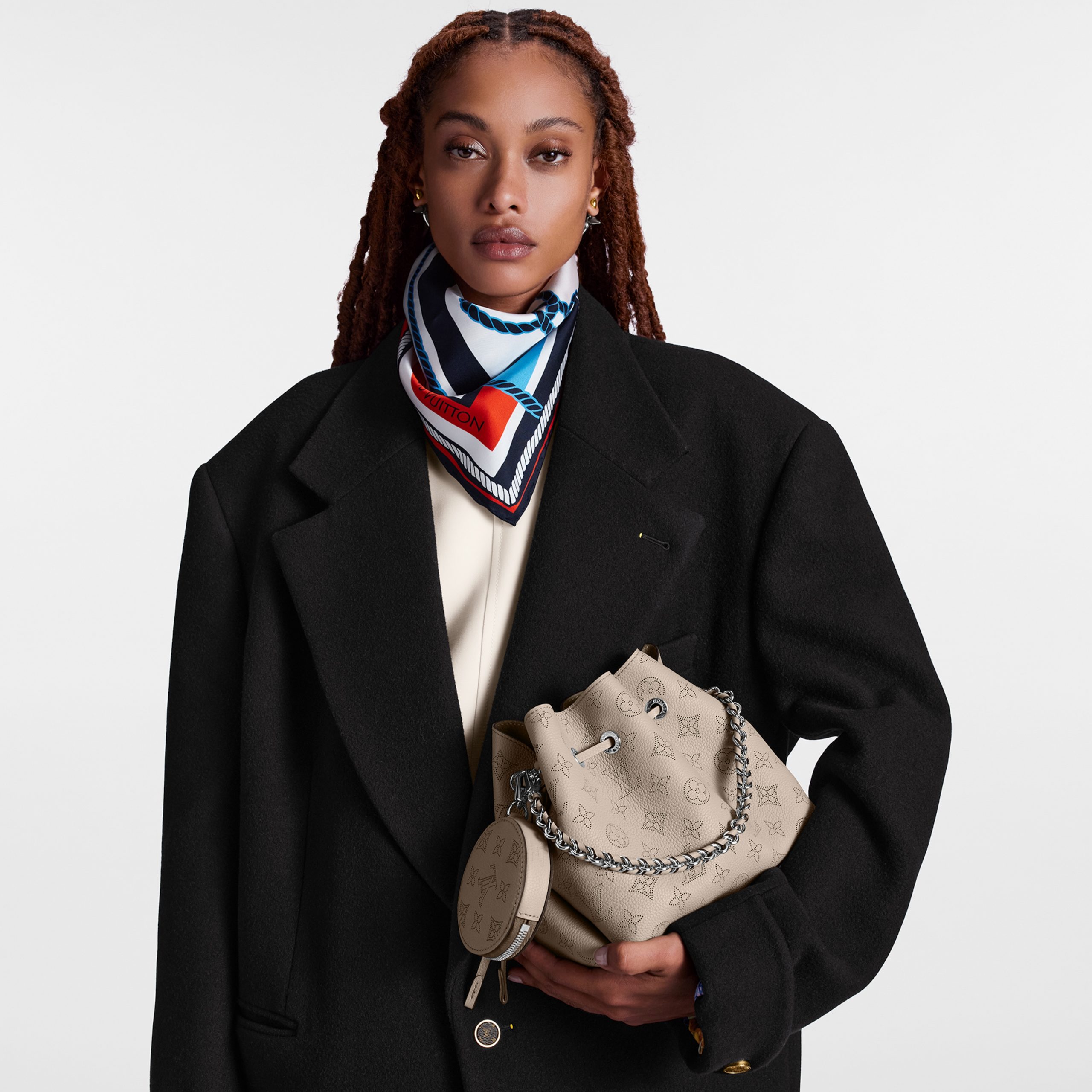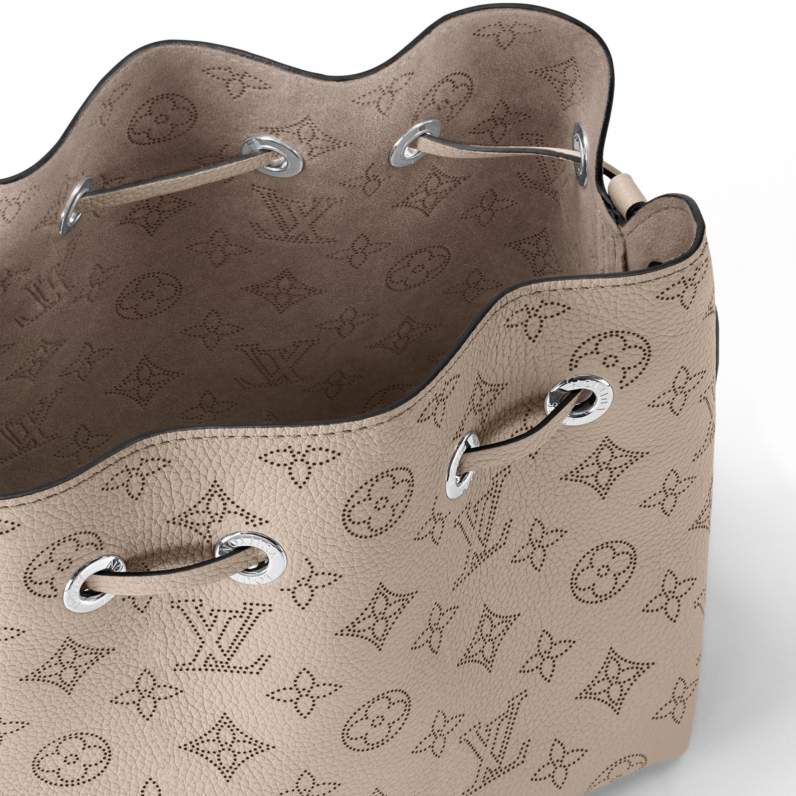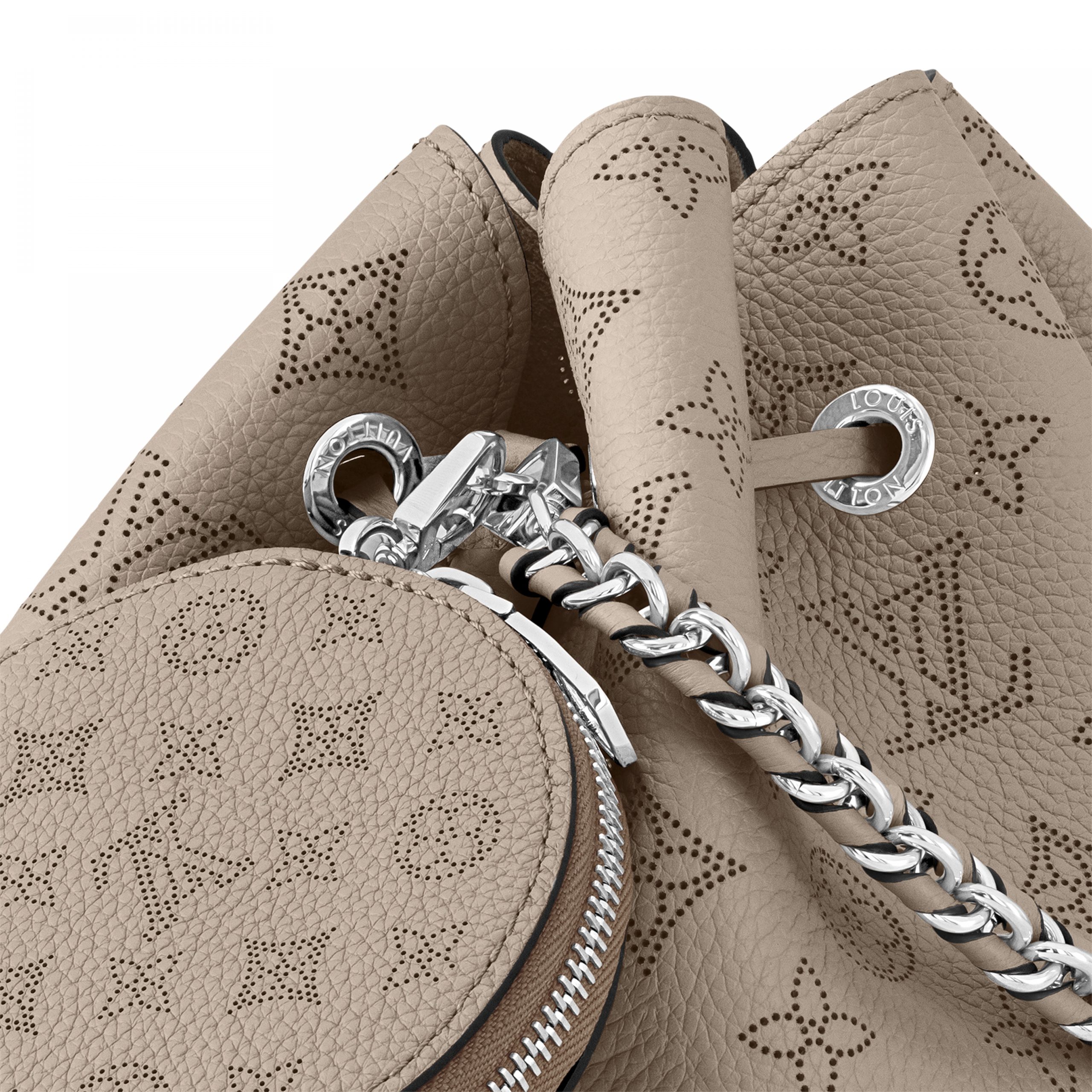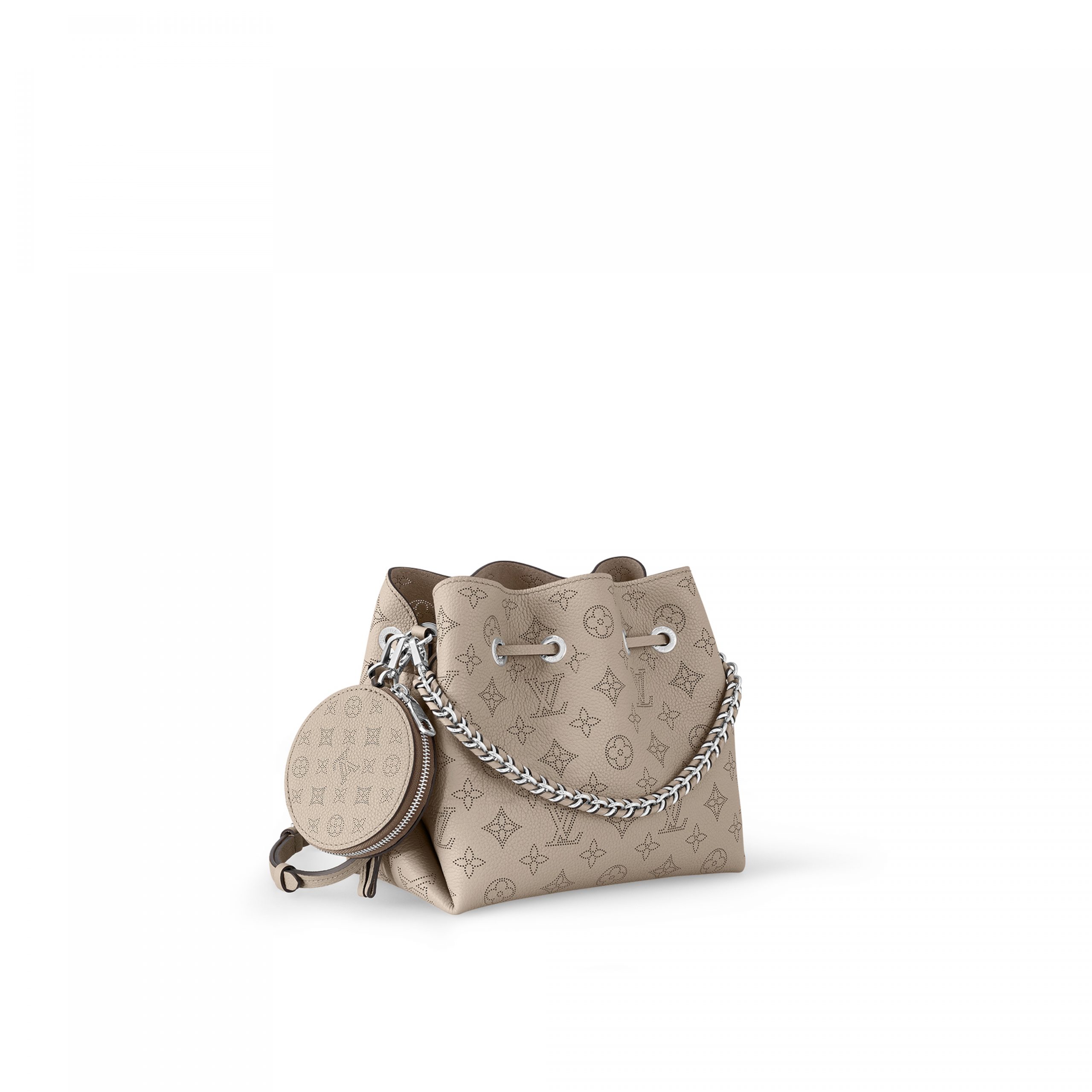 Louis Vuitton unveils the Bella bucket bag in Mahina calf leather with its perforated Monogram pattern. The bag’s small size and the attached round coin purse, featuring a miniature version of the perforated Monogram motif on one side, make it modern, desirable and trendy. The sophisticated leather and metal mixed handle associated with a removable leather strap bring versatility.