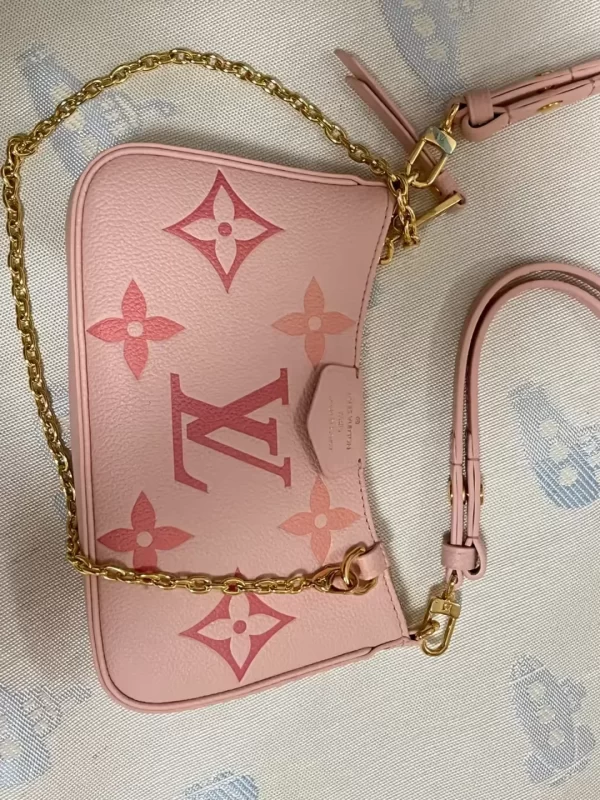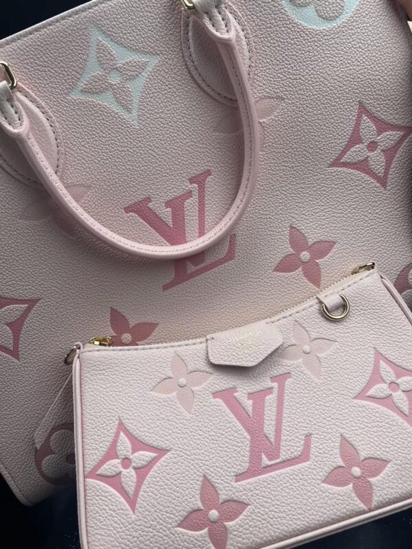 This edition of the Easy Pouch belongs to the Louis Vuitton Gradient collection. It is crafted from supple, embossed Monogram Empreinte leather, which is printed with a gradation of shades evoking a summer sunset. Large enough for everyday essentials, this bag has a removable chain and a removable, adjustable strap for shoulder or cross-body carry.