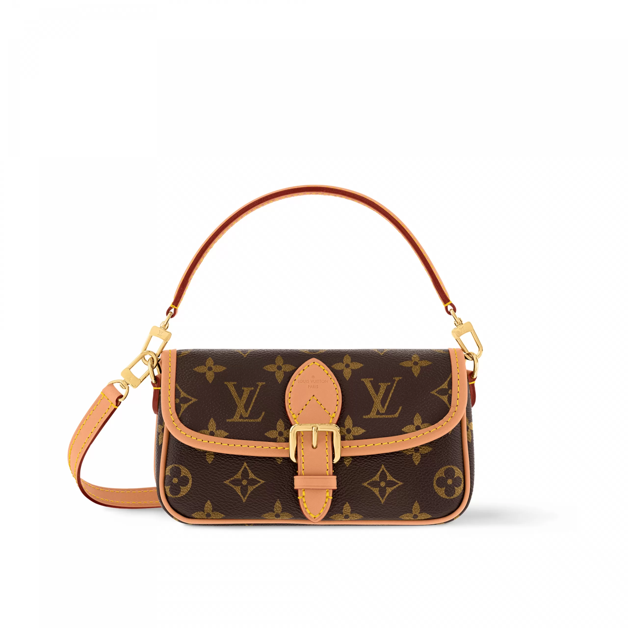 A miniature version of the Diane bag, the Nano Diane comes in Louis Vuitton’s iconic Monogram canvas. Ideal for essentials including a phone, this model is complemented by natural leather trim, which highlights its distinctive rounded flap and magnetic, belt-style closure. A removable handle and removable, adjustable shoulder strap offer different carry options.