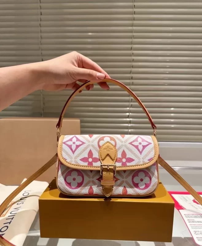 This edition of the Nano Diane bag belongs to the LV By the Pool summer collection. It comes in coated canvas printed with a colorful Monogram Tiles motif which evokes the Mediterranean. Leather trim complements this miniature version of the Diane bag, which is distinguished by its rounded flap and belt-style closure.