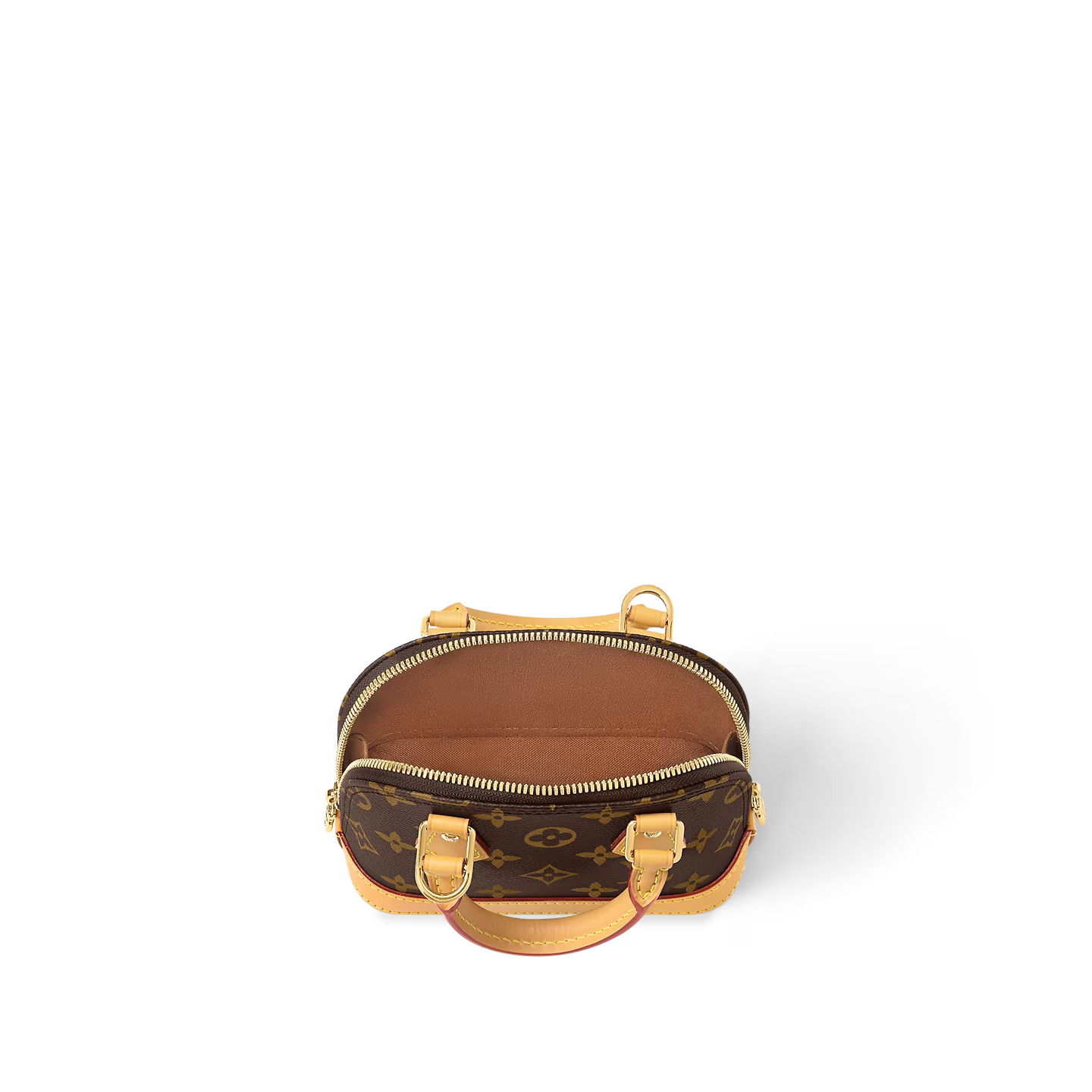 A miniature replica of the iconic Alma bag, the Nano Alma pairs Louis Vuitton’s signature Monogram canvas with natural leather trim. This exquisitely crafted piece combines heritage appeal with modern functionality: the double-zip closure reveals a surprisingly spacious interior, while the two leather handles and adjustable, removable shoulder strap offer multiple carry options.