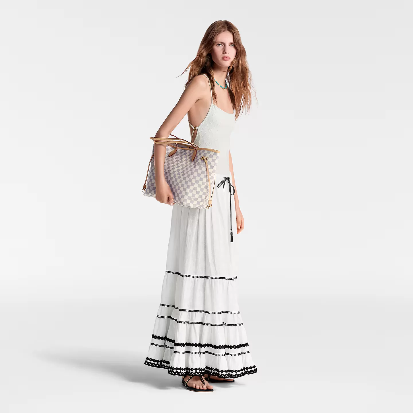 The Neverfull MM tote unites timeless design with heritage details. Made from fresh Damier Azur canvas with natural cowhide trim, it is roomy yet not bulky, with side laces that cinch for a sleek allure or loosen for a casual look. The slim leather handles slip easily over the shoulder or arm. Lined in colorful textile, it features a removable pouch which can be used as a clutch or an extra pocket.
