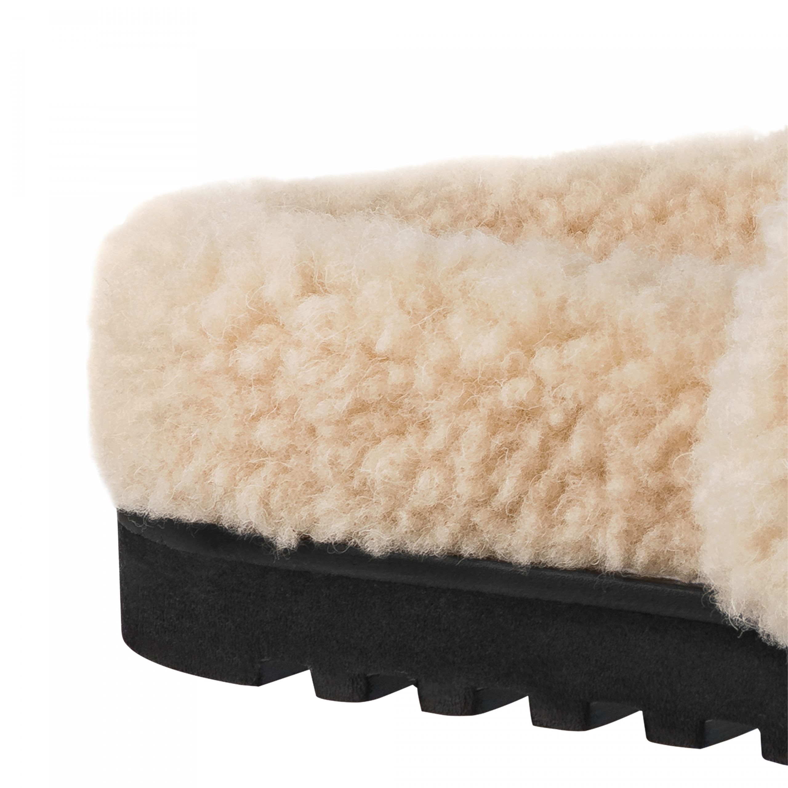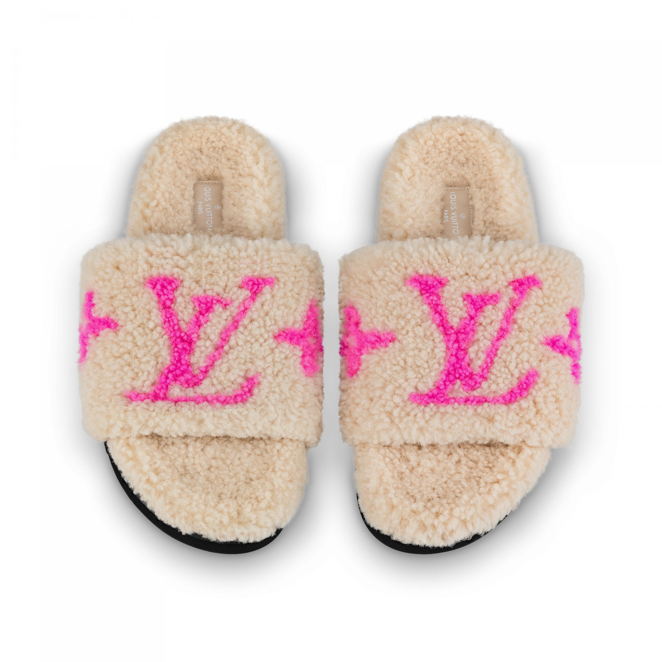 This wintry version of the Paseo flat comfort mule features a wide front strap in snug shearling with contrasting inserts forming the LV Initials and Monogram Flowers. A shearling-covered footbed provides optimum warmth and softness, making this style suitable for both indoor and outdoor wear. It is finished with a lightweight, treaded rubber outsole.