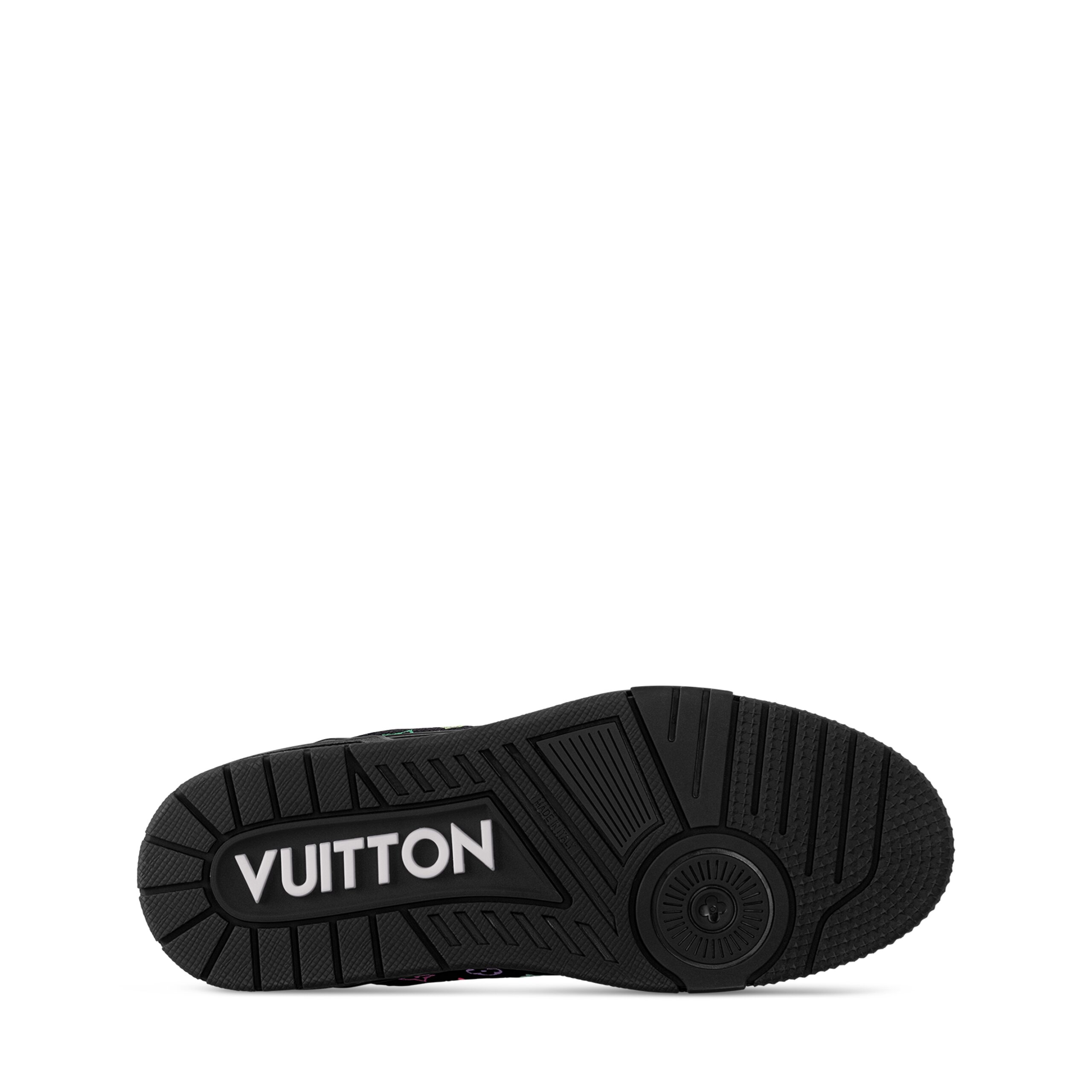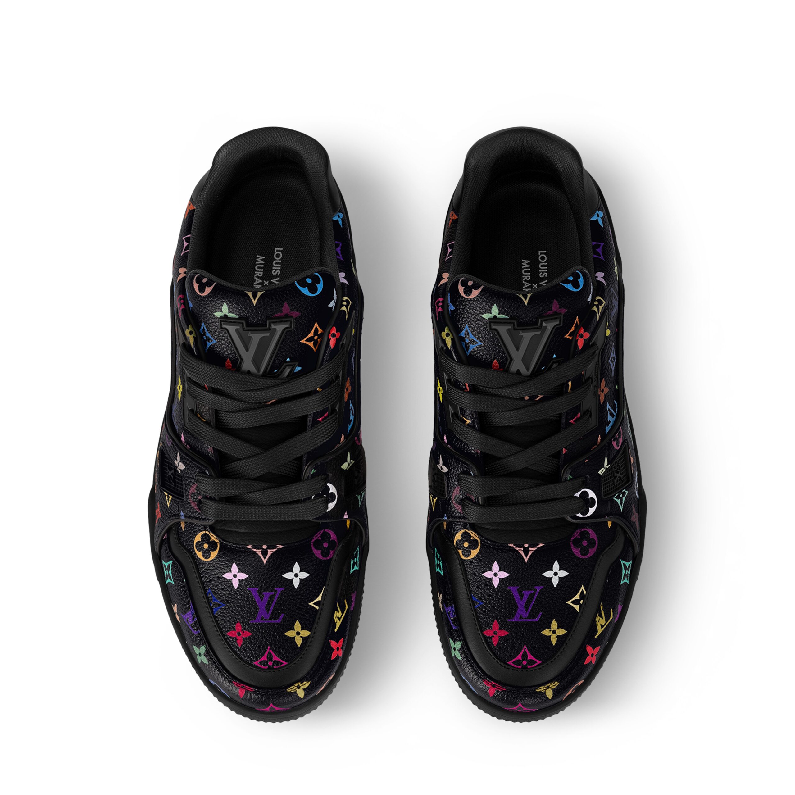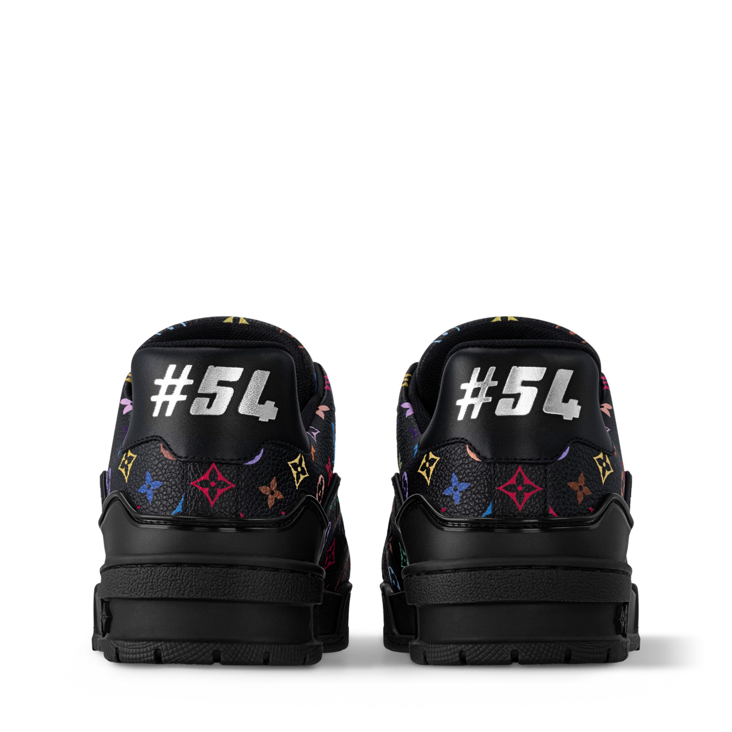 The iconic LV Trainer sneaker makes a fresh statement in grained calf leather featuring an allover print of a multicolored Monogram motif from the re-edition of Louis Vuitton x Murakami collection, inspired by the artist’s exuberant aesthetic. Informed by vintage sporty styles, the upper is detailed with a cursive Louis Vuitton signature, while the back is printed with the number 54 in reference to 1854, the year the House was founded.